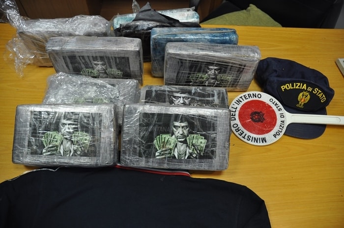 PALERMO – La polizia di Stato ha sequestrato 10 kg di cocaina imballata con le foto di Tony Montana, il protagonista di Scarface con Al Pacino, che tiene in mano mazzette di dollari. La droga era su un van per il trasporto di cavalli guidato da Luigi Alcamo, 39 anni, residente a Bagheria, che è stato arrestato per traffico di sostanze stupefacenti, dopo lo sbarco dal traghetto giunto a Palermo da Napoli.