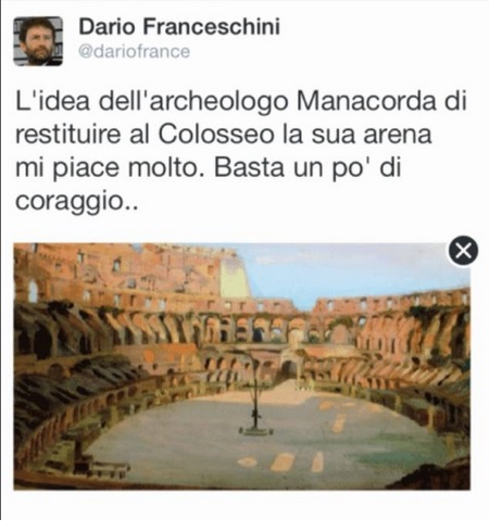 “L’idea dell’archeologo Manacorda di restituire al Colosseo la sua arena mi piace molto. Basta un po’ di coraggio”,