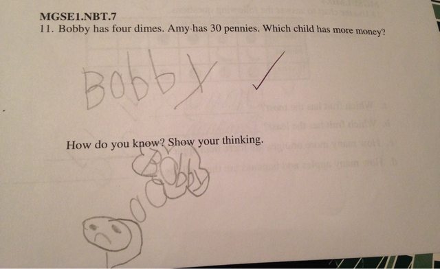 Considerando che 1 dime vale 10 centesimi e che Bobby ne ha 4 ce vagono così 40 penny, la risposta giusta al quiz è che Bobby ha più soldi di Amy. Il bimbo risponde correttamente alla prima domanda, ma è alla seconda che dà prova della sua genialità. La maestra infatti chiede ai bambini di “mostrare il loro ragionamento”, aspettandosi per iscritto i passaggi che lo hanno portato a capire chi aveva più soldi, esattamente come abbiamo appena fatto per rispondere alla domanda.