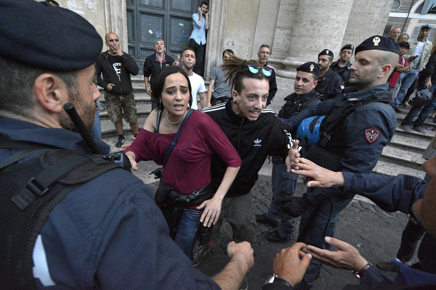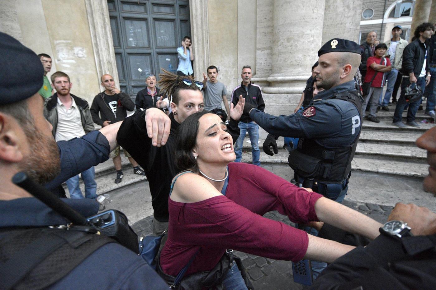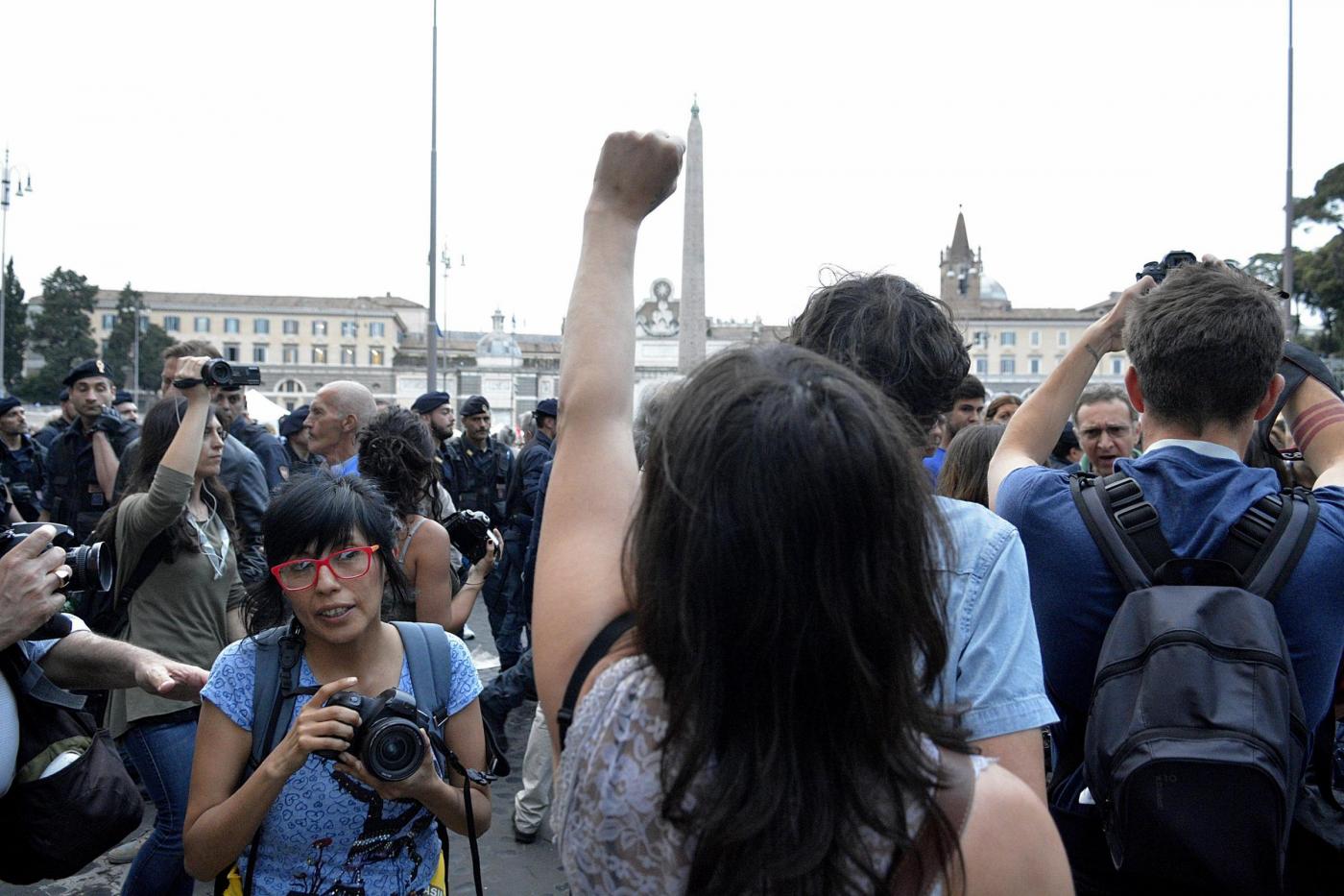 Durante il comizio un gruppo di persone che fanno riferimento ai movimenti per la casa ha tentato di entrare a piazza del Popolo e srotolare uno striscione, all’inizio della manifestazione elettorale del Pd.