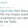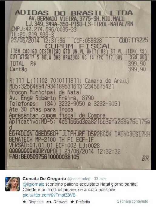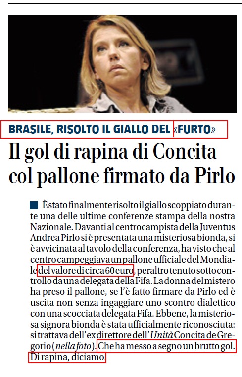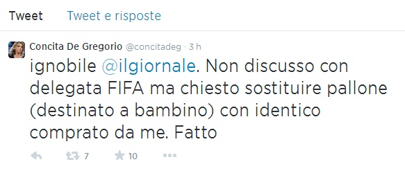 ROMA – Il Giornale contro Concita De Gregorio: “Ha preso un pallone ufficiale durante una conferenza stampa della Nazionale, se l’รจ fatto autografare da Pirlo ed รจ uscita non senza ingaggiare uno scontro dialettico con la scocciata delegata Fifa”. Lei, Concita De Gregorio, risponde via Twitter: “Ignobile Il Giornale. Non ho discusso con la delegata Fifa ma ho chiesto di sostituire il pallone (destinato a un bambino) con uno identico comprato da me”. Poi Concita De Gregorio ha pubblicato anche lo scontrino.
