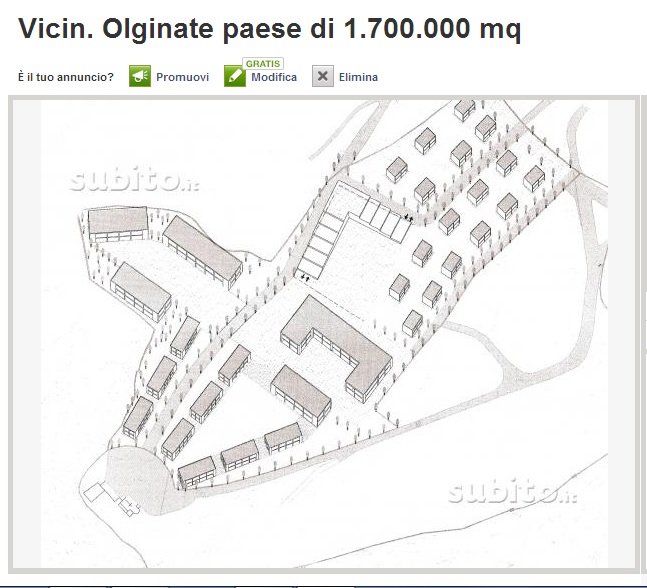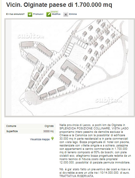 CONSONNO BRIANZA (LECCO) – Paese in vendita. O forse no. E’ giallo sull‘inserzione pubblicata dal sito Subito.it in cui si annuncia la vendita di un intero villaggio, creato negli anni Sessanta dal conte Mario Bagno su una collina della Brianza con vista sul lago di Como. Un villaggio fantasma con tanto di minareto alto 30 metri, chiesa e canonica, negozi in stile arabeggiante e sala da ballo all’aperto.