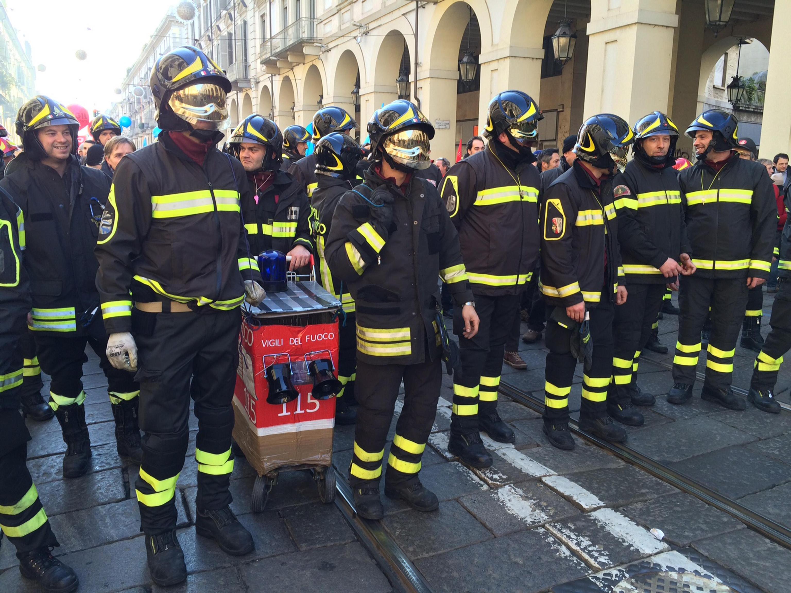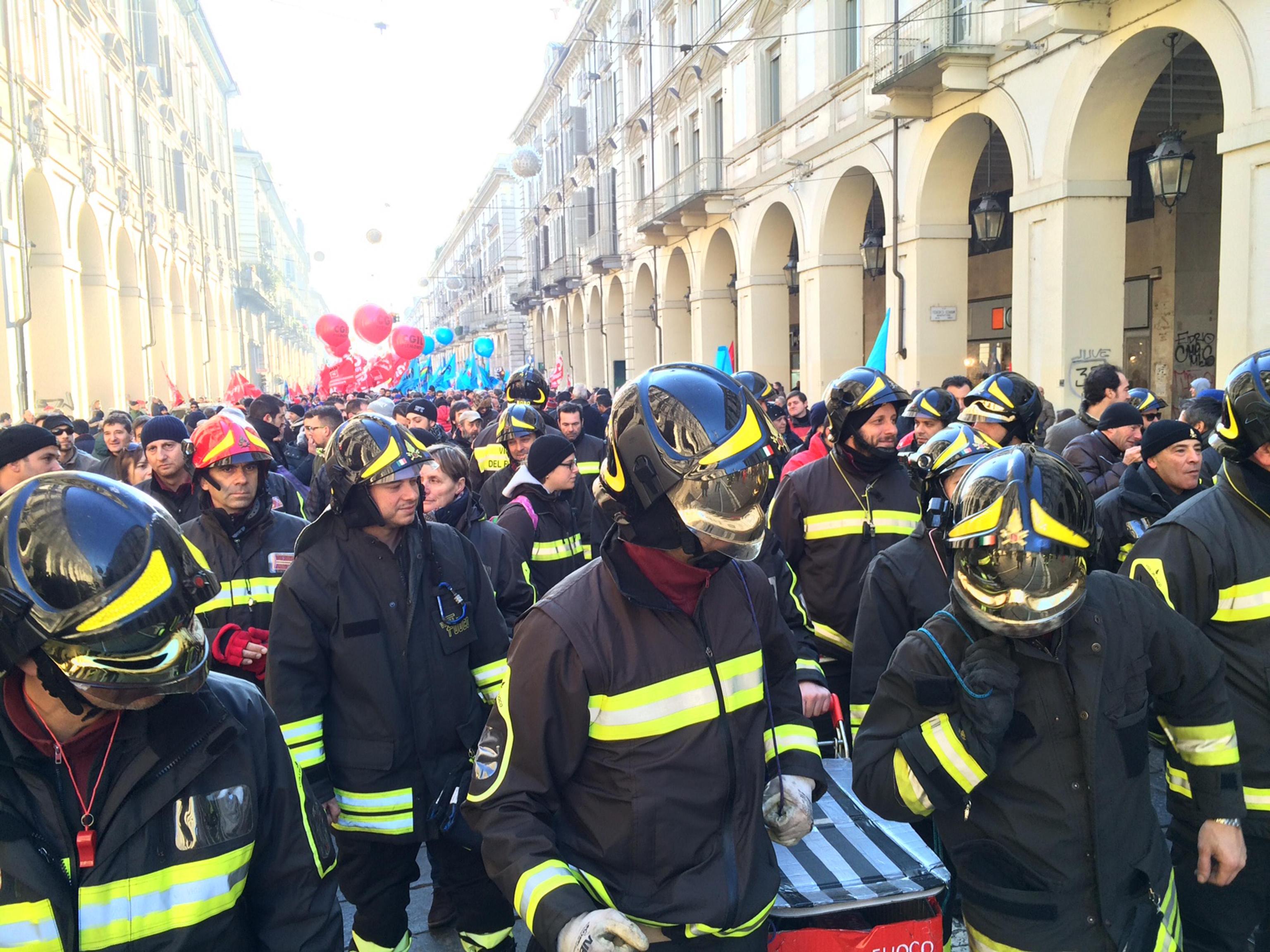 TORINO – Corteo Torino, pompieri in piazza con fumogeni e petardi. Una delegazione di vigili del fuoco, a Torino ha partecipato allo sciopero generale indetto da Cgil e Uil venerdì 12 dicembre 2014. Mentre gli antagonisti provavano ad andare verso il comune di Torino, i pompieri hanno dato vita a una protesta colorata e chiassosa ma naturalmente pacifica: gli agenti hanno accesso dei fumogeni, fatto scoppiare dei petardi ed acceso le sirene di ordinanza. Poi dopo qualche minuto i vigili del fuoco si sono messi a cantare e a saltare durante il passaggio del corteo.