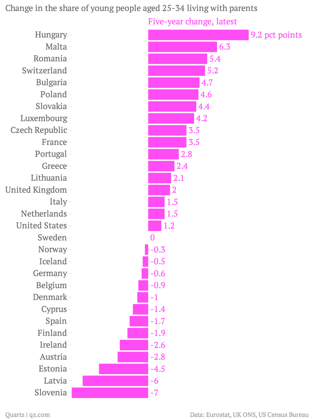 In Gran Bretagna, per esempio, la quota dei figli rimasti a casa di mamma e papà è aumentata del 10% negli ultimi 10 anni, nella fascia d’età fra 25 e 34. In altri Paesi, come la Spagna, la percentuale è diminuita perché, spiega Quartz, nell’ultimo quinquennio il 16% dei giovani fra 25 e 34 anni è espatriato per via della crisi.