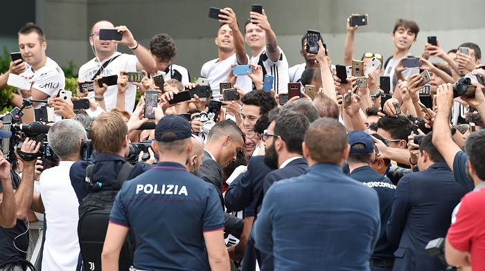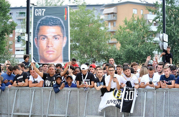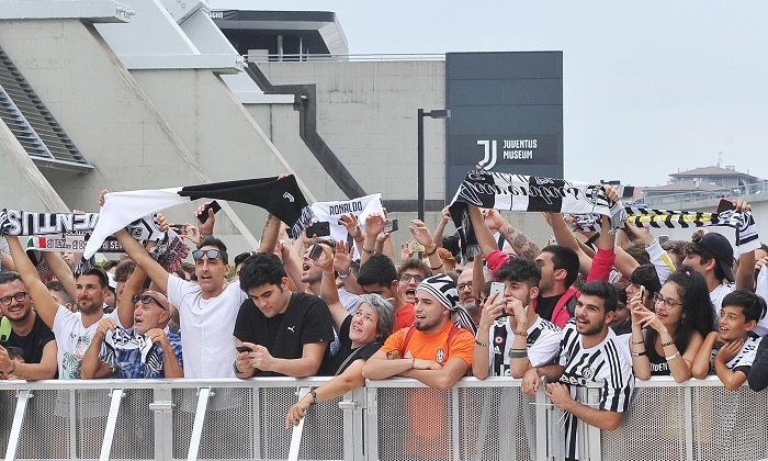 TORINO – Bagno di folla per Cristiano Ronaldo, che si sta concedendo ai primi selfie con i tifosi della Juventus assiepati a migliaia di fronte al JMedical. “Ronaldo portaci la Champions”, il coro con cui l’attaccante portoghese è stato accolto. Nel pomeriggio la conferenza stampa alle 18.30 all’Allianz Stadium. [App di Blitzquotidiano, gratis, clicca qui,- Ladyblitz clicca qui –Cronaca Oggi, App on Google Play] Il fuoriclasse portoghese non verrà presentato nella sala stampa ma nella più ampia sala d’onore dedicata a Gianni e Umberto Agnelli.
