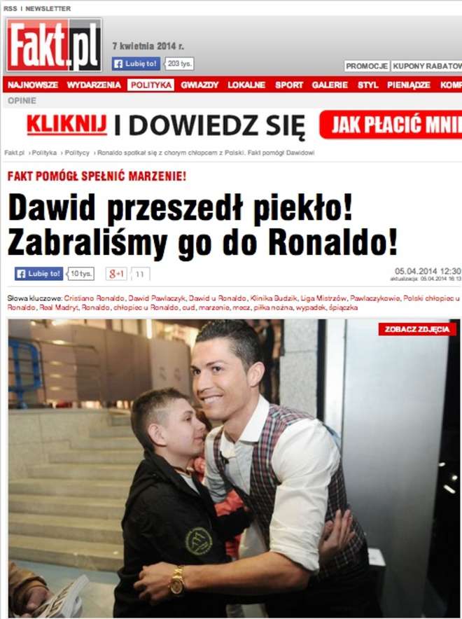 Il campione portoghese, una volta venuto a conoscenza della vicenda, ed essendo molto attivo in campo ‘umanitario’, ha voluto conoscere il piccolo David, ospitandolo al ‘Santiago Bernabeu’ di Madrid, in occasione della partita di Champions League tra il Real e il Borussia Dortmund”.