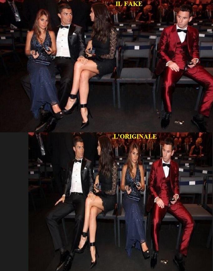ROMA – Cristiano Ronaldo che ruba la fidanzata a Lionel Messi nel corso della cerimonia per la consegna del Pallone d’oro. La foto è una bufala ma è diventata virale grazie ai social network: eccola affiancata all’originale.