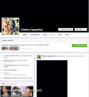 ORVIETO – L’hanno trovata in un lago di sangue nell’abitazione dei suoi genitori a Grotte di Castro. Poche ore prima Cristina Cappelloni, 29 anni, su Facebook aveva cambiato l’immagine del profilo pubblicando una foto totalmente nera. Lunedì mattina doveva andare a lavoro, uno studio di avvocati dove lavorava come segretaria, ma Cristina Cappelloni aveva avvertito le sue colleghe dicendo di non poter andare per motivi di salute. Poi il cambio dell’immagine profilo su Facebook. E alle 11.30 Cristina Cappelloni si è tolta la vita sparandosi con la pistola del padre. Dopo qualche ora sono stati i genitori a ritrovarla riversa in un lago di sangue. Accanto al corpo alcuni biglietti scritti dalla ragazza prima del suicidio.