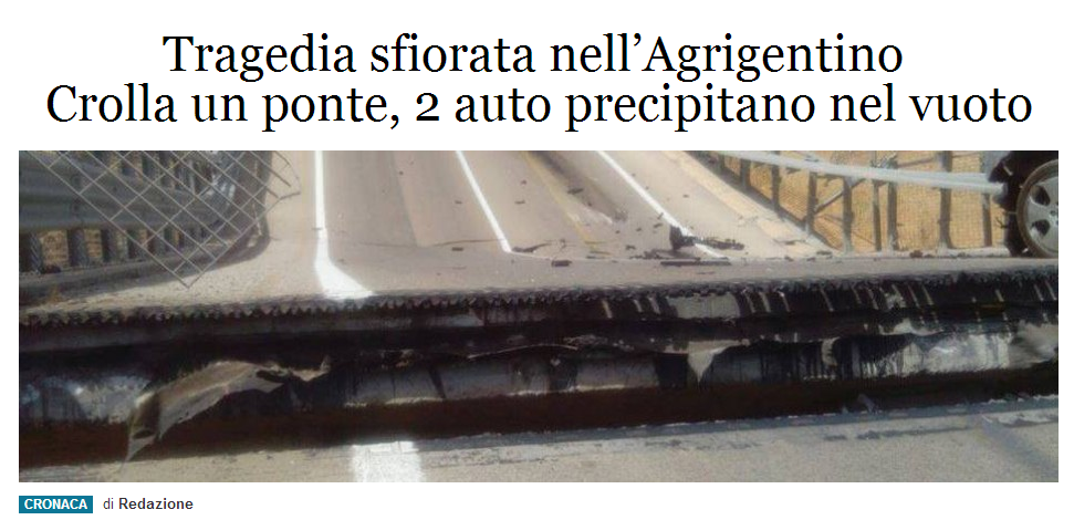 AGRIGENTO – Un ponte รจ crollato la mattina del 7 luglio tra Ravanusa e Licata, in provincia di Agrigento.ย Sono 4 i feriti, tra i quali una donna incinta, della catena di incidenti verificatisi per il crollo di una campataย del ponte che collega con Campobello di Licata, Ravanusa, Canicattรฌ. L’incidente รจ avvenuto in contrada Petrulla, lungo la statale 626, ย a causa di un cedimento strutturale di una campata del viadotot “Petrulla” che ha fatto sรฌ che le carreggiate si siano piegate verso il basso, toccando il fondo, da un’altezza di circa 4 metri.