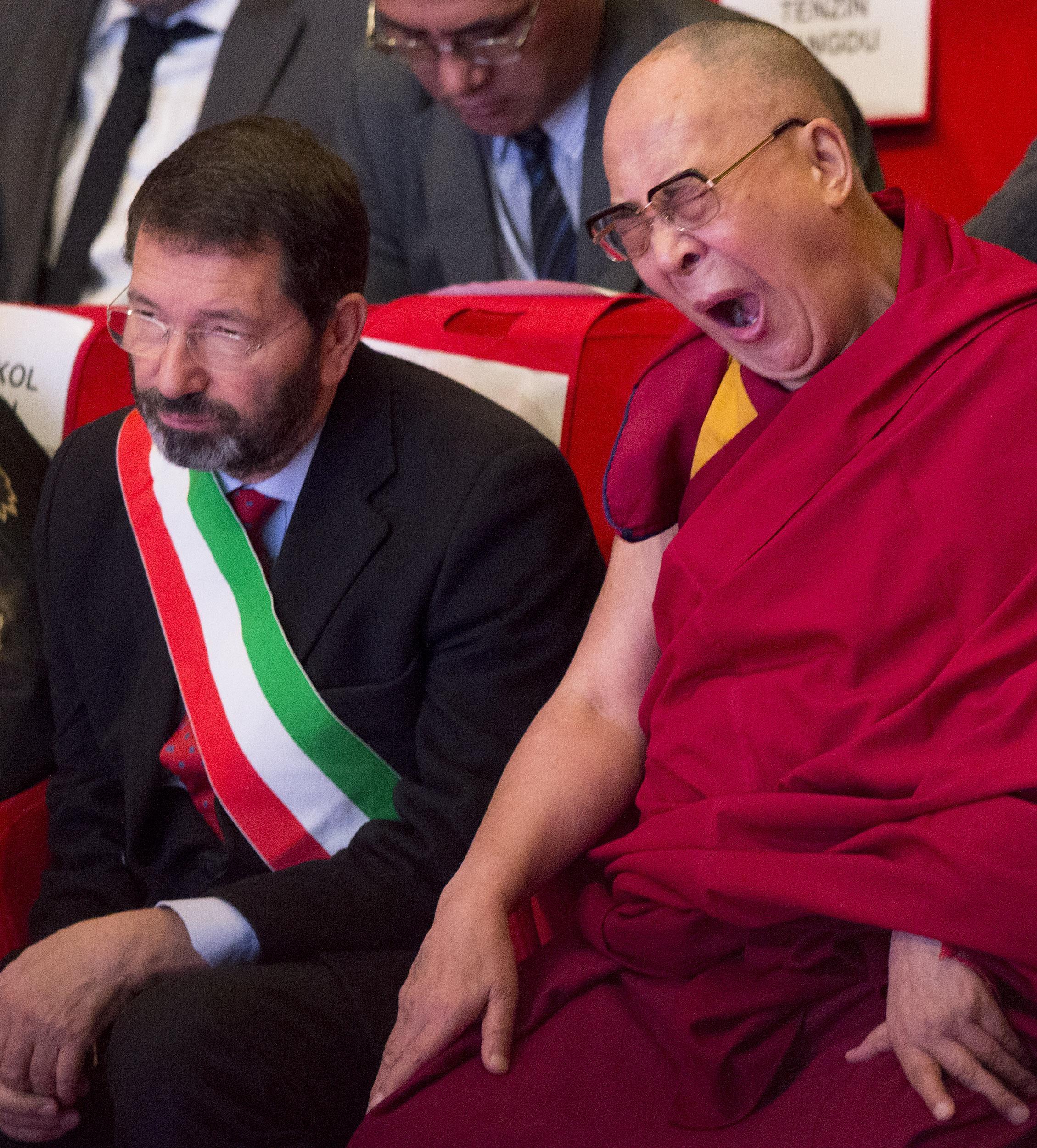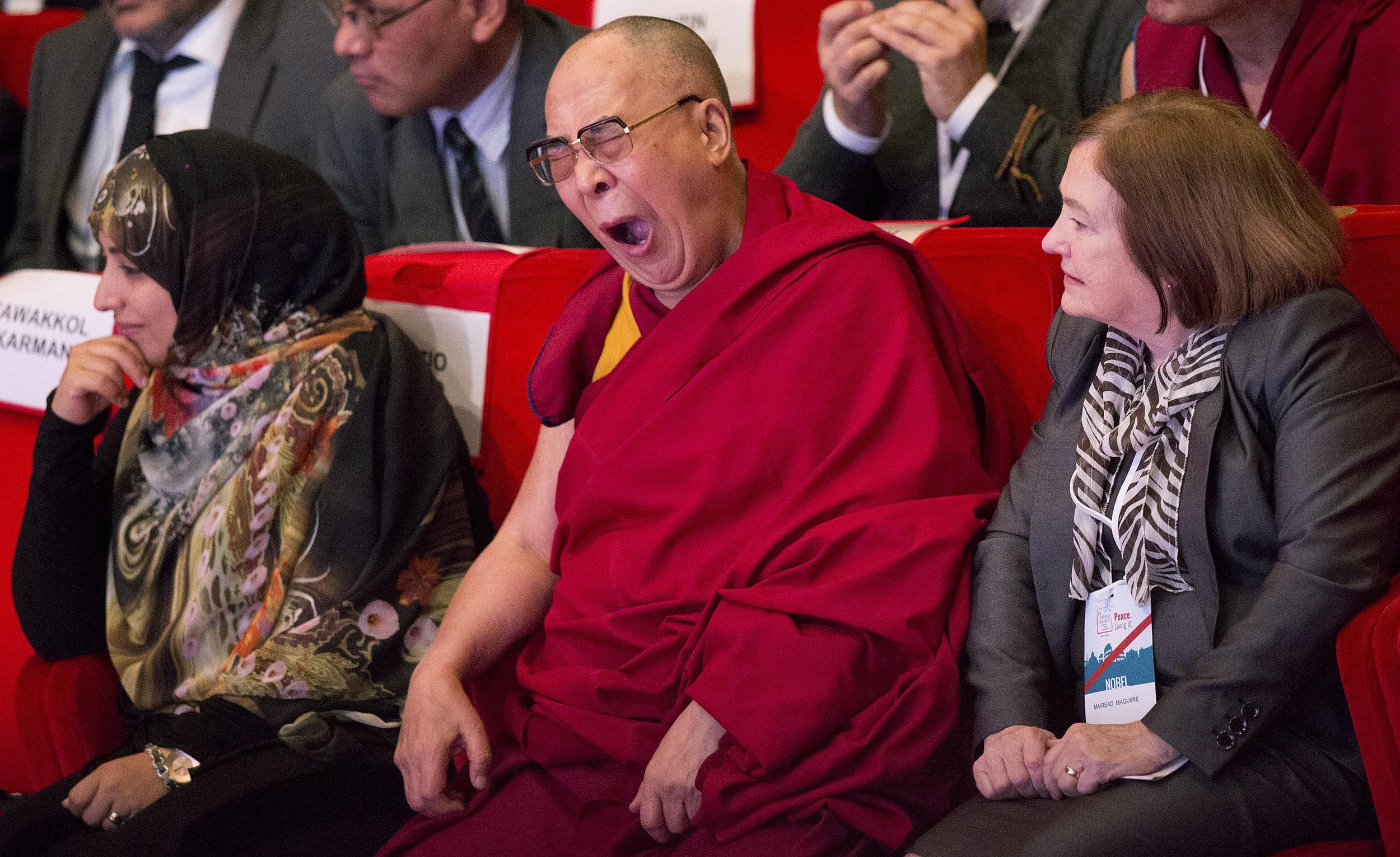 ROMA – Sarà stato il fuso orario o la noia di ascoltare i premi Nobel per la Pace che parlavano. Fatto sta che il Dalai Lama, oggi a Roma per il 14esimo summit mondiale dei premi Nobel per la Pace è stato immortalato dall’Ansa mentre sbadiglia per ben due volte.