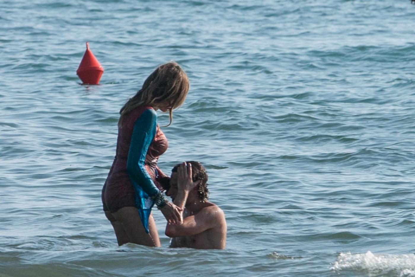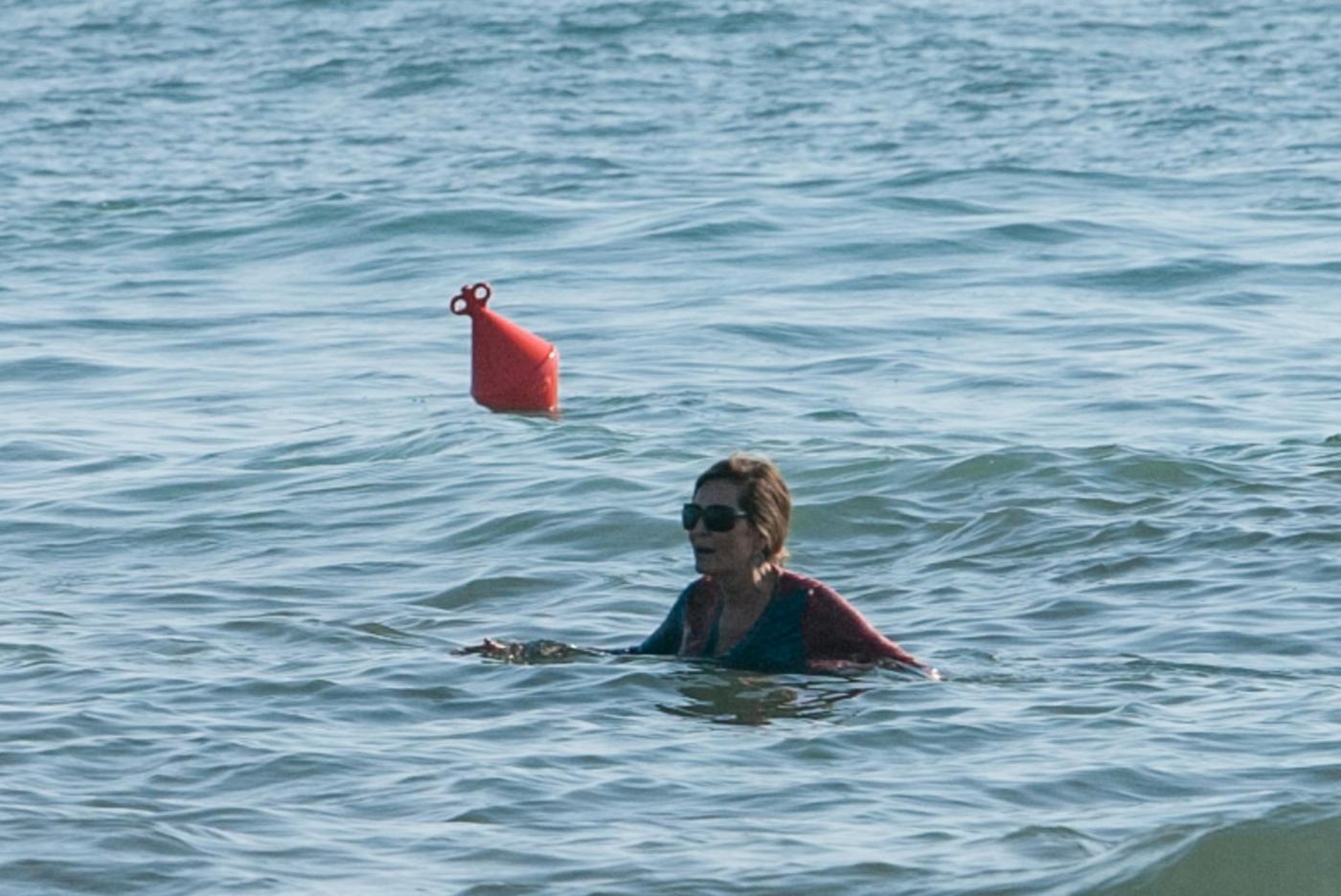 Dopo la sfida a due, la ‘pitonessa’ organizza una partita di beach tennis con il figlio e un amico. La Santanchè, 54 anni compiuti, sembra una ragazzina con un vestinino cortissimo e coloratissimo che non toglie nemmeno quando si tuffa in mare con il figlio Lorenzo Mazzaro. All’improvviso sembra che il ragazzo si faccia male e la mamma è subito pronta a dargli attenzioni e coccole, abbracciandolo mentre esce dall’acqua. Foto LaPresse.