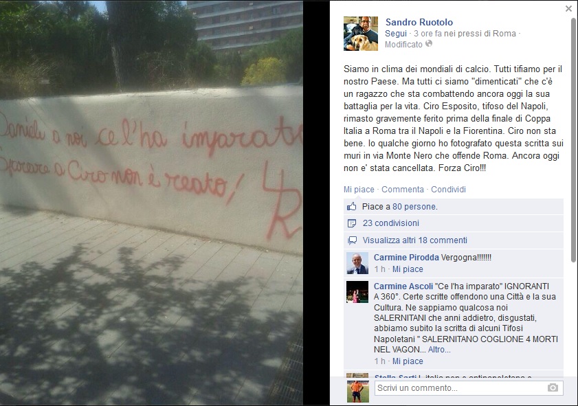 “Siamo in clima dei mondiali di calcio. Tutti tifiamo per il nostro Paese. Ma tutti ci siamo “dimenticati” che c’è un ragazzo che sta combattendo ancora oggi la sua battaglia per la vita. Ciro Esposito, tifoso del Napoli, rimasto gravemente ferito prima della finale di Coppa Italia a Roma tra il Napoli e la Fiorentina. Ciro non sta bene. Io qualche giorno ho fotografato questa scritta sui muri in via Monte Nero che offende Roma. Ancora oggi non e’ stata cancellata. Forza Ciro!!!”