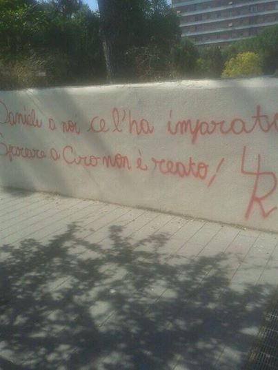È l’ennesima scritta a favore di Daniele De Santis e contro Ciro Esposito, principale accusato e principale vittima della sparatoria avvenuta in via Tor di Quinto il pomeriggio del 3 maggio, giorno in cui all’Olimpico si è giocata la finale di Coppa Italia Napoli-Fiorentina, passata alla cronaca più per gli incidenti prima della partita che per la vittoria per 3-1 del Napoli.