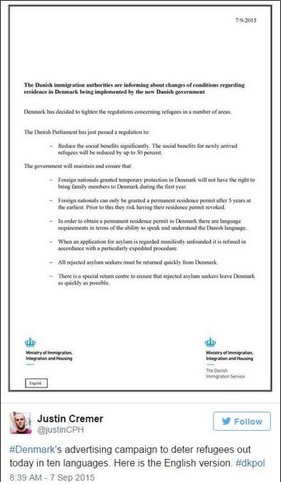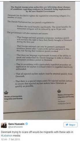 COPENHAGEN – “Cari profughi non venite qui”. Firmato il governo danese. La lettera di non benvenuto arriva dal governo danese e viene fatta pubblicare su diversi giornali libanesi in lingua araba e inglese.