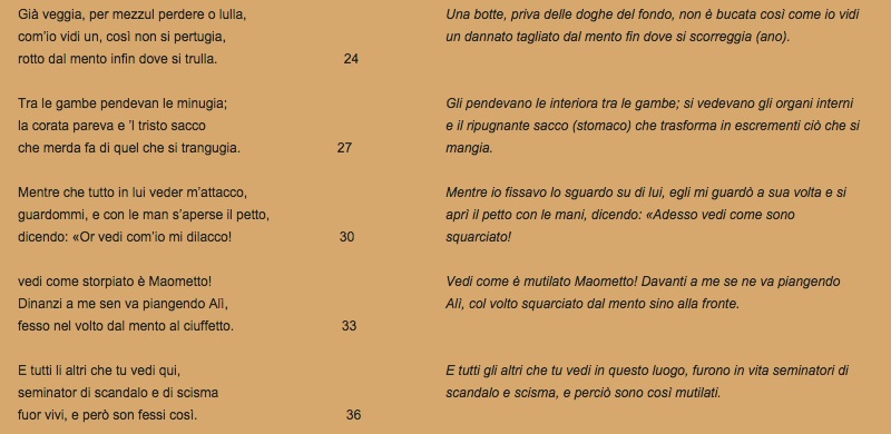 Secondo quella che era la visione medievale, Maometto è rappresentato come uno scismatico e l’Islam come una eresia. Al Profeta è perciò riservata una pena atroce: il suo corpo è spaccato dal mento al deretano in modo che le budella gli pendono dalle gambe, immagine che già di per sé basterebbe a far infuriare gli integralisti che due giorni fa lo hanno vendicato a colpi di kalashnikhov nella redazione di Charlie Hebdo.
