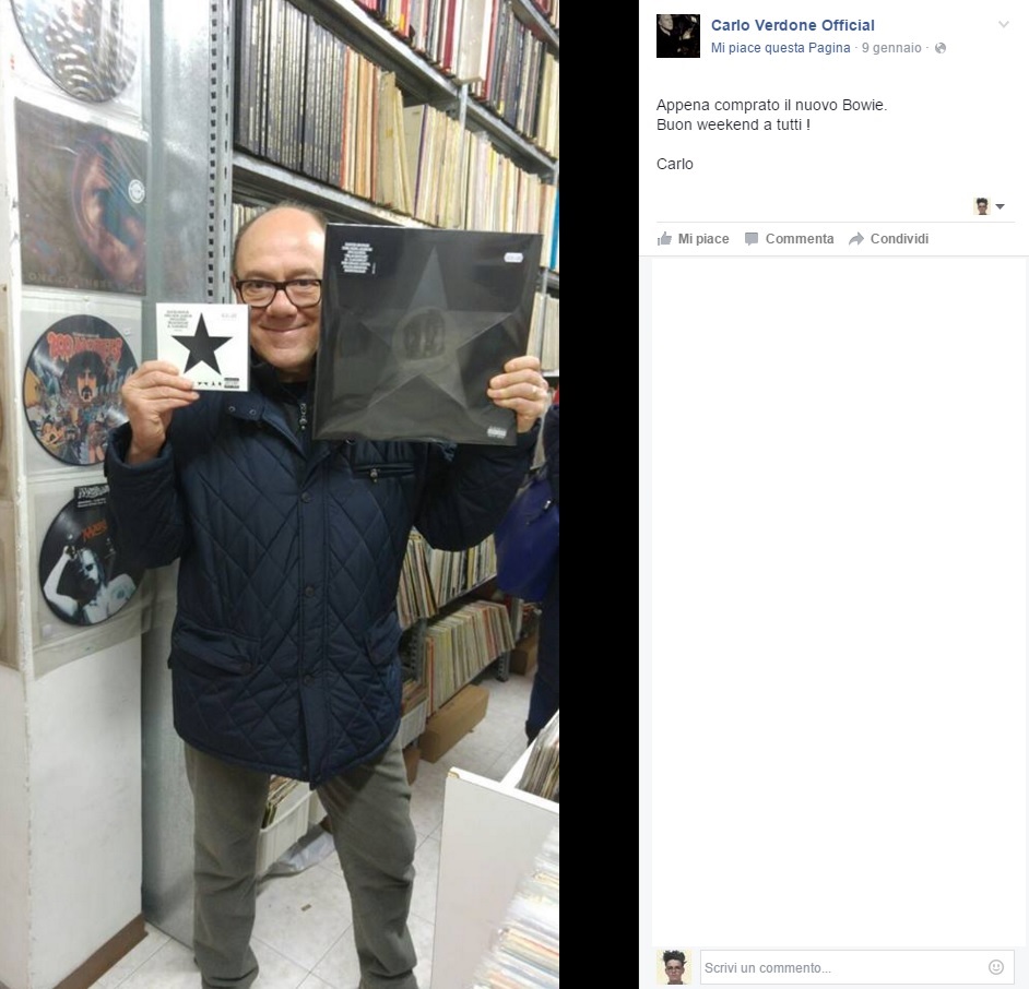 ROMA – Ciao Duca. Sono in tanti fra cantanti, registi e personaggi del mondo della musica italiani a rendere omaggio a David Bowie. Carlo Verdone, attraverso il suo profilo ufficiale Facebook che ha da poco aperto ricorda un artista “colto e sensibile” e fa riferimento ad un incontro avvenuto anni fa: “Chiamare l’album Black Star era un oscuro presagio, stava male, da molto tempo nell’ambiente si sapeva. Lui era un artista avanguardista, sperimentatore di talenti unico. Mancherà a tutti noi la sua genialità sempre innovativa. E’ morto giovane nell’anima. Ebbi il privilegio di conoscerlo – dice ancora Verdone – e parlarci a lungo a Milano a casa di Gianni Versace dopo un concerto dei suoi Tin Machine. Colto, sensibile, autorevole. Bowie era vera arte. Black star disco difficile al primo ascolto è assoluto capolavoro di un signore che ci ha lasciati ancora giovane”. Poi, in un’intervista a Repubblica, Verdone racconta i particolari di quell’incontro avvenuto nel 1991 mentre era a Milano per le riprese di “Maledetto il giorno che ti ho incontrato”. Lui e Margherita Buy vanno al concerto di Bowie al Teatro Smeraldo: lì incontrano Gianni Versace che li invita a casa dopo lo spettacolo. In quella occasione Verdone conosce Bowie, che si rivela un grande esperto di storia dell’arte.