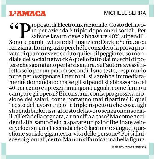 “Proposta di Electrolux razionale. Costo del lavoro per azienda è triplo dopo oneri sociali. Per salvare lavoro deve abbassare 40% stipendi”. Sono le parole twittate dal finanziere Davide Serra, area renziana. Lo ringrazio perché le considero la prova provata di quanto avevo scritto qui ieri: il peggiore uso mondiale dei social network è quello fatto dai maschi di potere che sgomitano per farsi sentire. Se l’autore avesse riletto solo per un paio di secondi il suo testo, respirando forte per ossigenare i neuroni, si sarebbe immediatamente domandato: ma se gli stipendi si abbassano del 40 per cento e i prezzi rimangono uguali, come fanno a campare gli operai? E i consumi, con la progressiva erosione dei salari, come potranno mai ripartire? E quel “costo del lavoro triplo” è triplo rispetto a che cosa, agli stipendi bielorussi, al costo del lavoro senza oneri sociali, all’età della cognata, a una cifra a caso? Ma come accidenti si fa, santo cielo, a sparare un paio di belinate veloci veloci su una faccenda che è lacrime e sangue, questione sociale gigantesca, vita delle persone? Poi si finisce sui giornali, certo. Ma non si fa mica una bella figura.