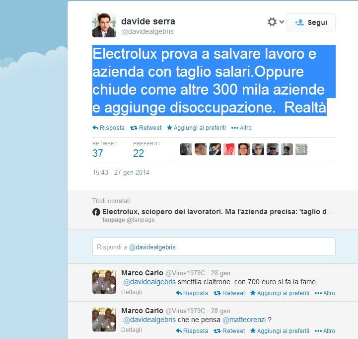 ROMA – Questo tweet a favore del piano di tagli della Electrolux di Davide Serra, quarantaduenne finanziere ritenuto uno dei consiglieri economici di Matteo Renzi, non è passato inosservato: