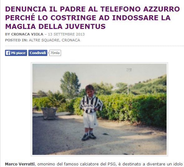 ROMA – Denuncia il padre al Telefono Azzurro perchè lo costringe ad indossare la maglia della Juventus. Questa storia curiosa è raccontata sulle pagine di Cronaca Viola – portale dedicato alla Fiorentina ed ai suoi tifosi –  riportiamo di seguito l’articolo.