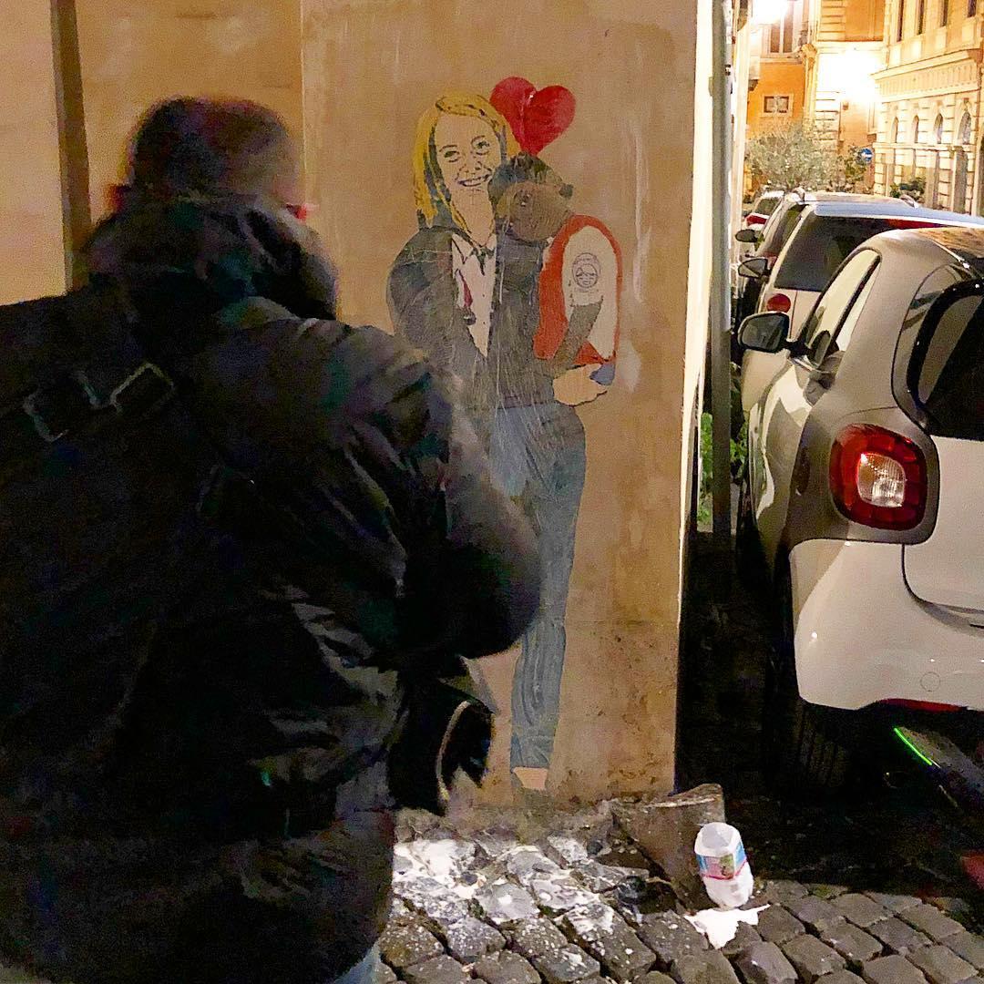 Il murales sarebbe opera dello street artist Tvboy. Ma Salvini e Di Maio non sono gli unici soggetti ritratti: vicino al Senato spunta infatti una seconda immagine che ritrae Giorgia Meloni nelle vesti di volontaria di Save The Children, con tanto di bimbo “colorato” in braccio.