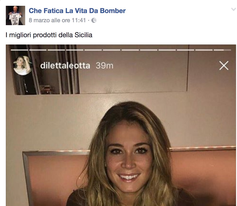 ROMA – Diletta Leotta torna alla ribalta delle cronache. Merito di una foto postata sulla pagina Facebook “Che Fatica La Vita Da Bomber”, in cui, sotto la didascalia “I migliori prodotti della Sicilia”, appare la conduttrice di Sky Sport che tiene in mano un piatto di arancini.