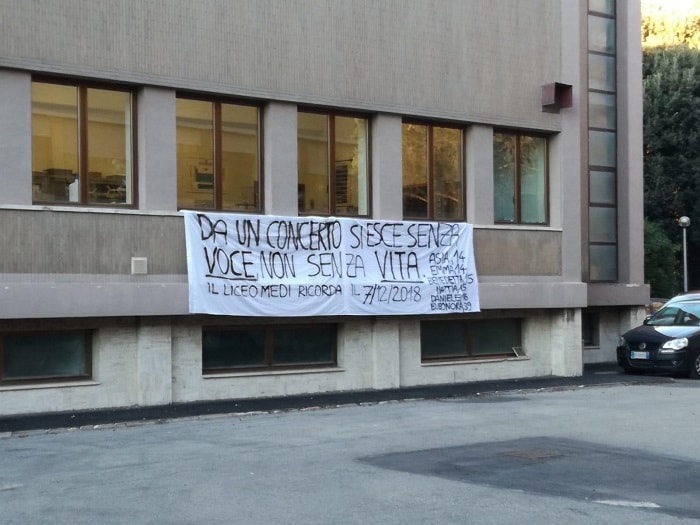 Intanto fuori dal Liceo Medi di Senigallia è stato appeso uno striscione con su scritto: “Da un concerto si esce senza voce, non senza vita. Il Liceo Medi ricorda Asia, Emma, Benedetta, Mattia, Daniele, Eleonora”. La scuola era frequentata da Asia Nasoni, 14 anni, una delle vittime della calca nella discoteca Lanterna azzurra. All’lItis Volterra Elia di Ancona invece, sono stati deposti dei fiori per Daniele Pongetti. Il ragazzo aveva 16 anni ed è una delle vittime di questa tragedia (foto Ansa).