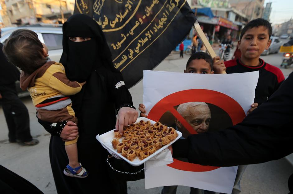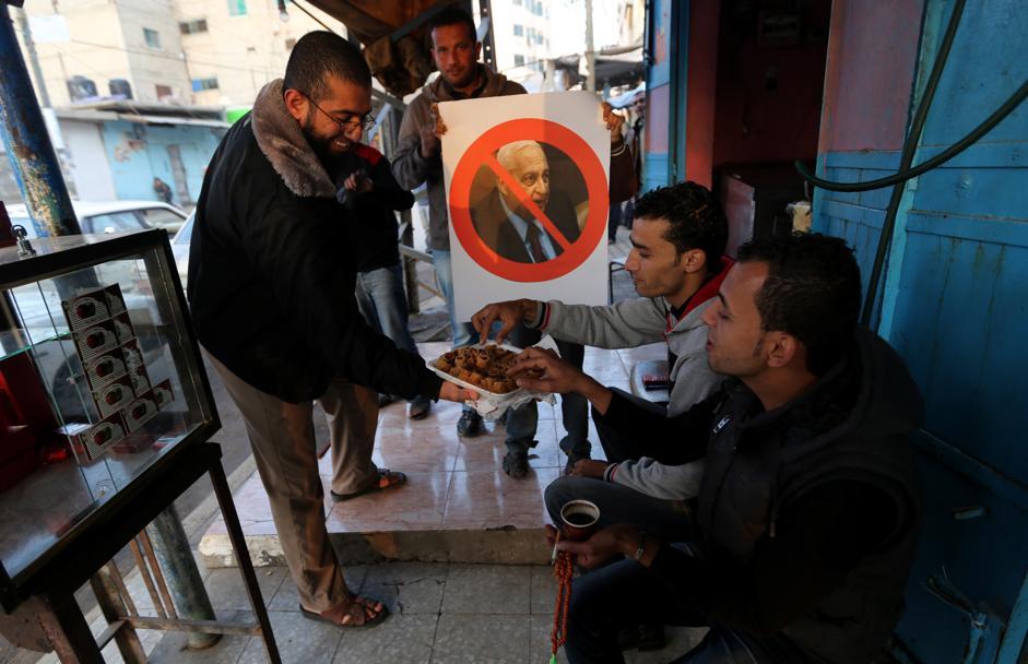 GAZA – A Khan Younis nel sud della Striscia di Gaza, i palestinesi esultano per la morte di Ariel Sharon, definito da Hamas un “criminale con le mani coperte di sangue palestinese”, distribuendo dolcetti per la strada.