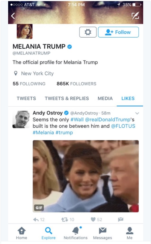 WASHINGTON – “Sembra che l’unico muro costruito da Donald Trump sia quello tra lui e Melania Trump”. Con questo tweet il blogger di sinistra Andy Ostoy, ha incassato ieri numerosi “mi piace”. Ma uno su tutti ha scatenato gossip e ironie sulla stampa internazionale: quello di Melania Trump, attraverso l’account ufficiale @FLOTUS, acronimo che sta per First Lady of the United States. Probabilmente una svista, un dito scivolato per sbaglio, tant’è che il “like” è stato cancellato dopo meno di un’ora.