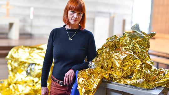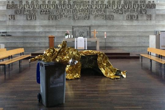 L’opera rappresenta sculturalmente la fuga di migliaia di persone dalla miseria e dalle violenze. Ma la reazione di Menze-Kuhn, dopo l’iniziale indignazione, è stata decisamente signorile. Valutata l’impossibilità di recuperare la forma originaria, l’artista ha integrato nella sua nuova versione i fogli termici dorati buttati e l’intero cassonetto. L’installazione è aperta ai visitatori almeno fino al 14 febbraio. Sempre che l’involontaria pubblicità ricevuta non richieda un prolungamento dell’esposizione.