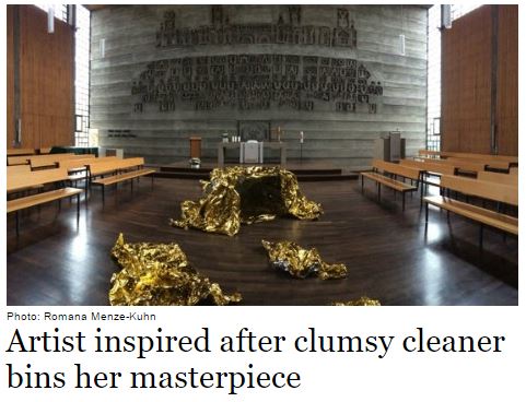 BERLINO – Un cumulo di coperte isotermiche dorate che simboleggia l’epopea dei migranti. Questa l’opera d’arte esposta 15 giorni fa al museo Philippuskirche a Mannheim, in Germania, che è stata scambiata per immondizia da una donna delle pulizie e gettata nei cassonetti dei rifiuti. Ancora una volta un’installazione di arte moderna finisce così gettata nella spazzatura per un errore di valutazione. A ritrovare l’opera d’arte tra i rifiuti l’artista, Romana Menze-Kuhn, che ha immediatamente constatato l’impossibilità di recuperare integralmente la sua creazione, messa in mostra appena quindici giorni fa.