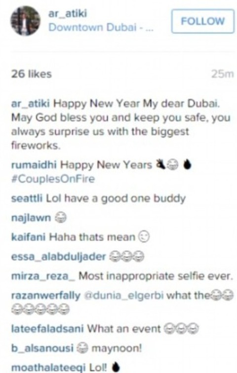 I due, dopo aver cercato l’angolazione giusta in modo tale che il rogo fosse bene in vista, hanno sfoderato i loro sorrisi. Poi, a scatto avvenuto hanno caricato l’immagine sul web accompagnandola con un commento: “Buon anno mia cara Dubai. Che Dio ti benedica e ti tenga al sicuro. Ci sorprendi sempre con i tuoi enormi fuochi d’artificio”. Il messaggio non è stato accolto con grasse risate come i due avrebbero voluto, ed ha fatto infuriare gli utenti dei social network che hanno cominciato ad insultare la coppia.
