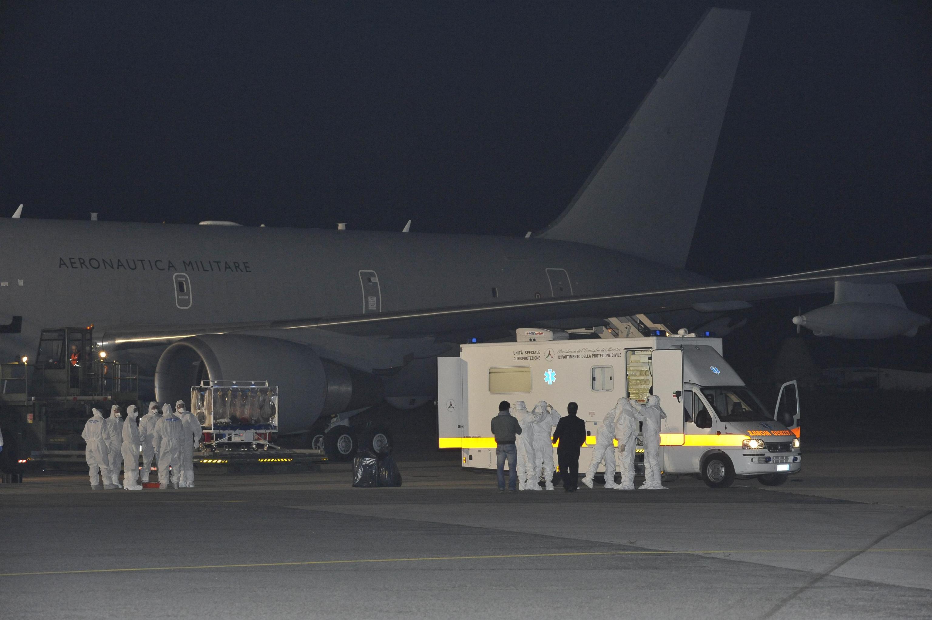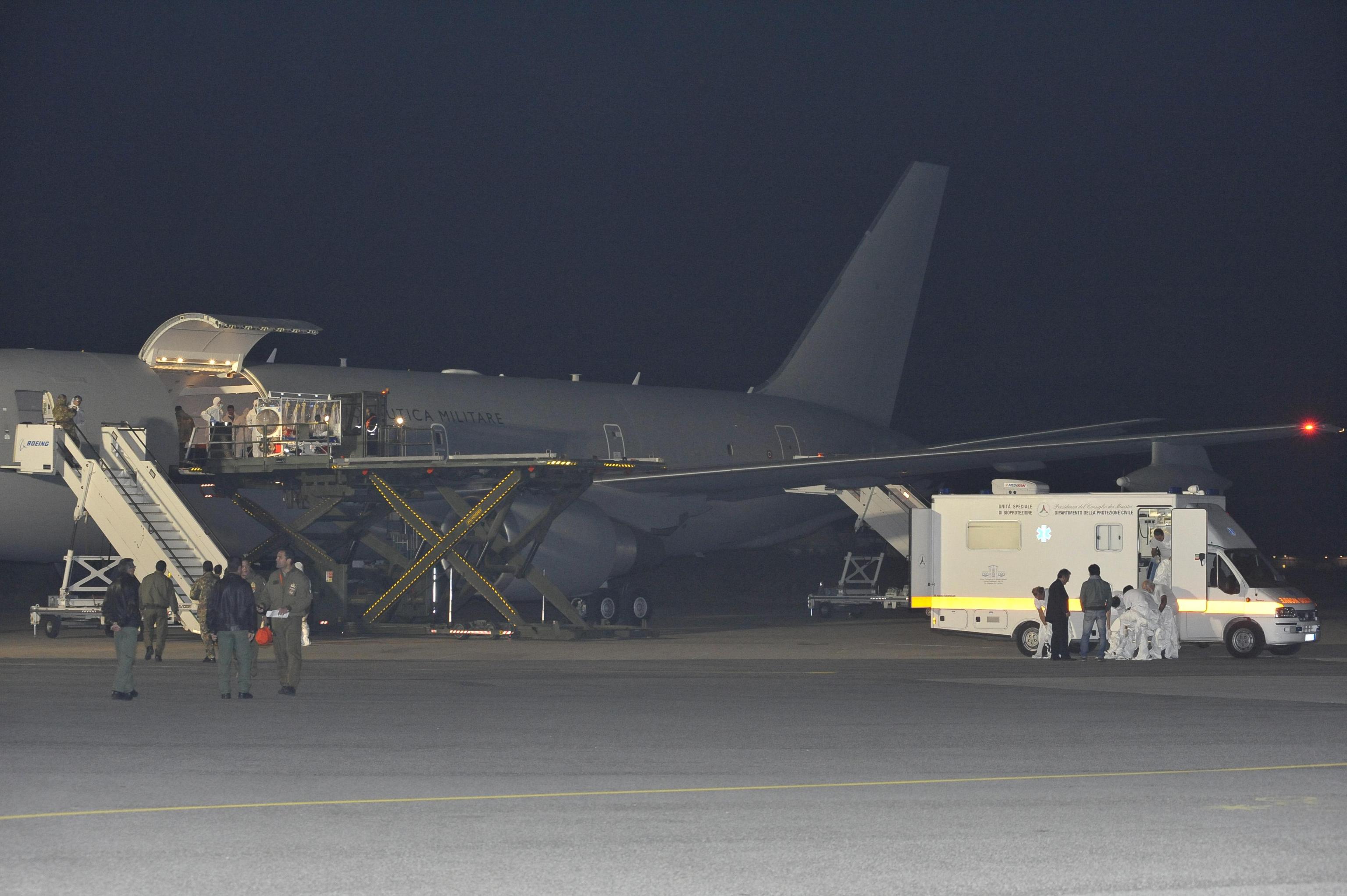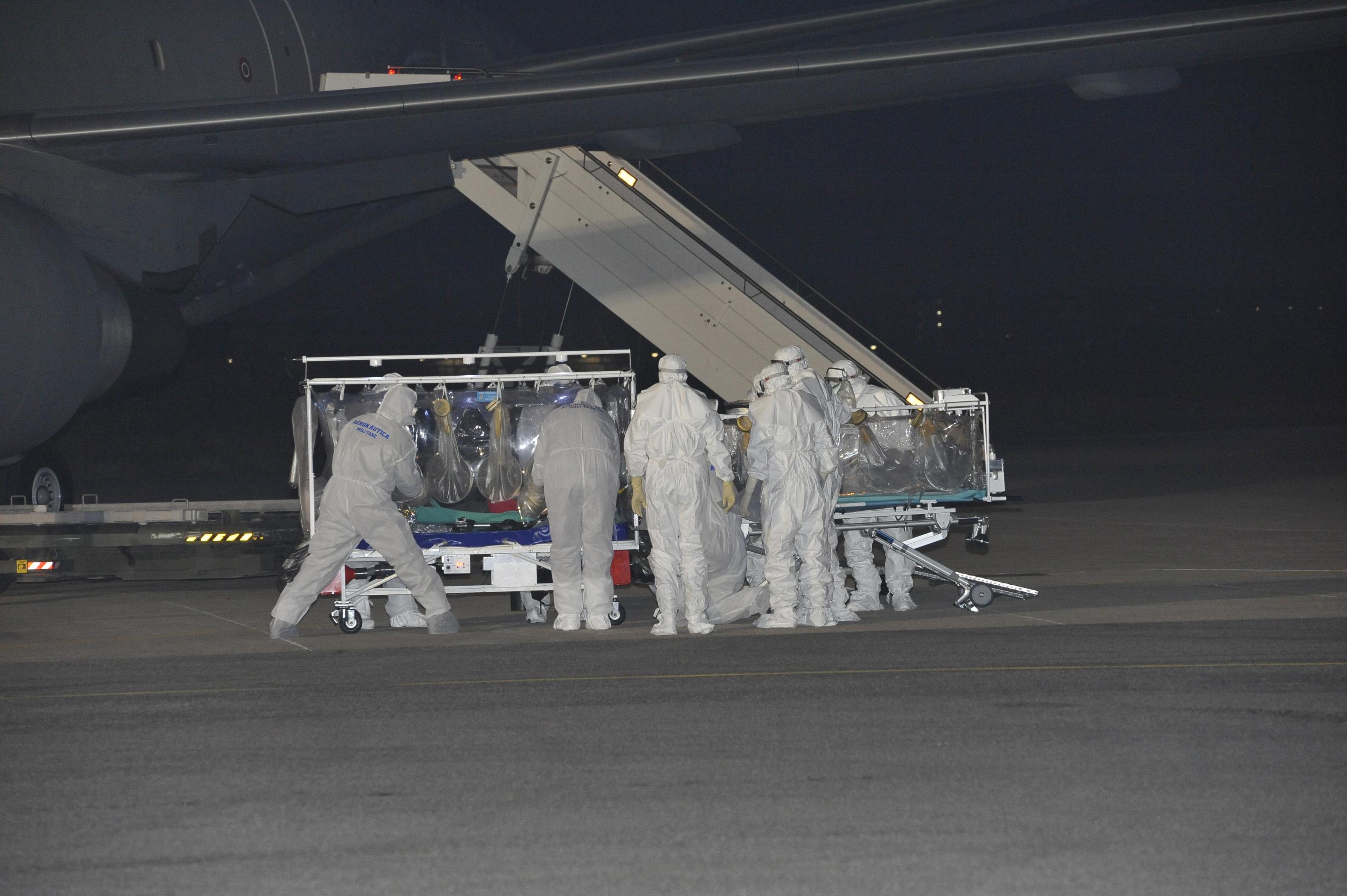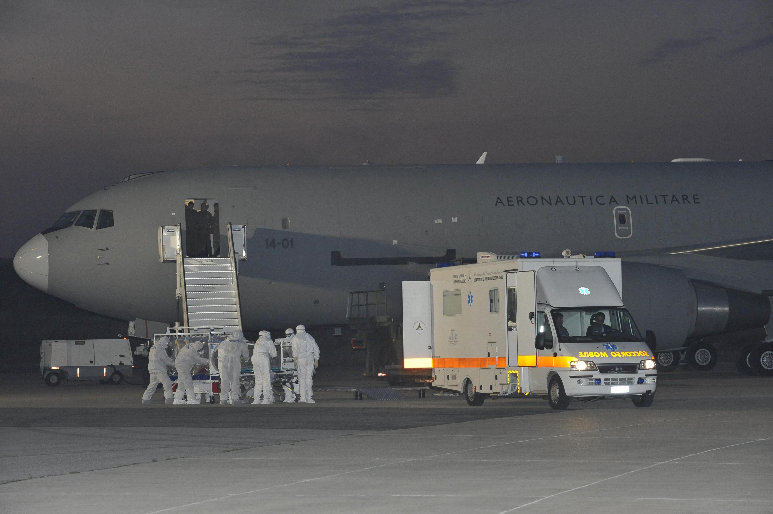 Il medico contagiato è stato prelevato in Sierra Leone, dove è atterrato e subito ripartito il Boeing KC 767 dell’Aeronautica configurato appositamente per questo tipo di trasporti sanitari di emergenza.