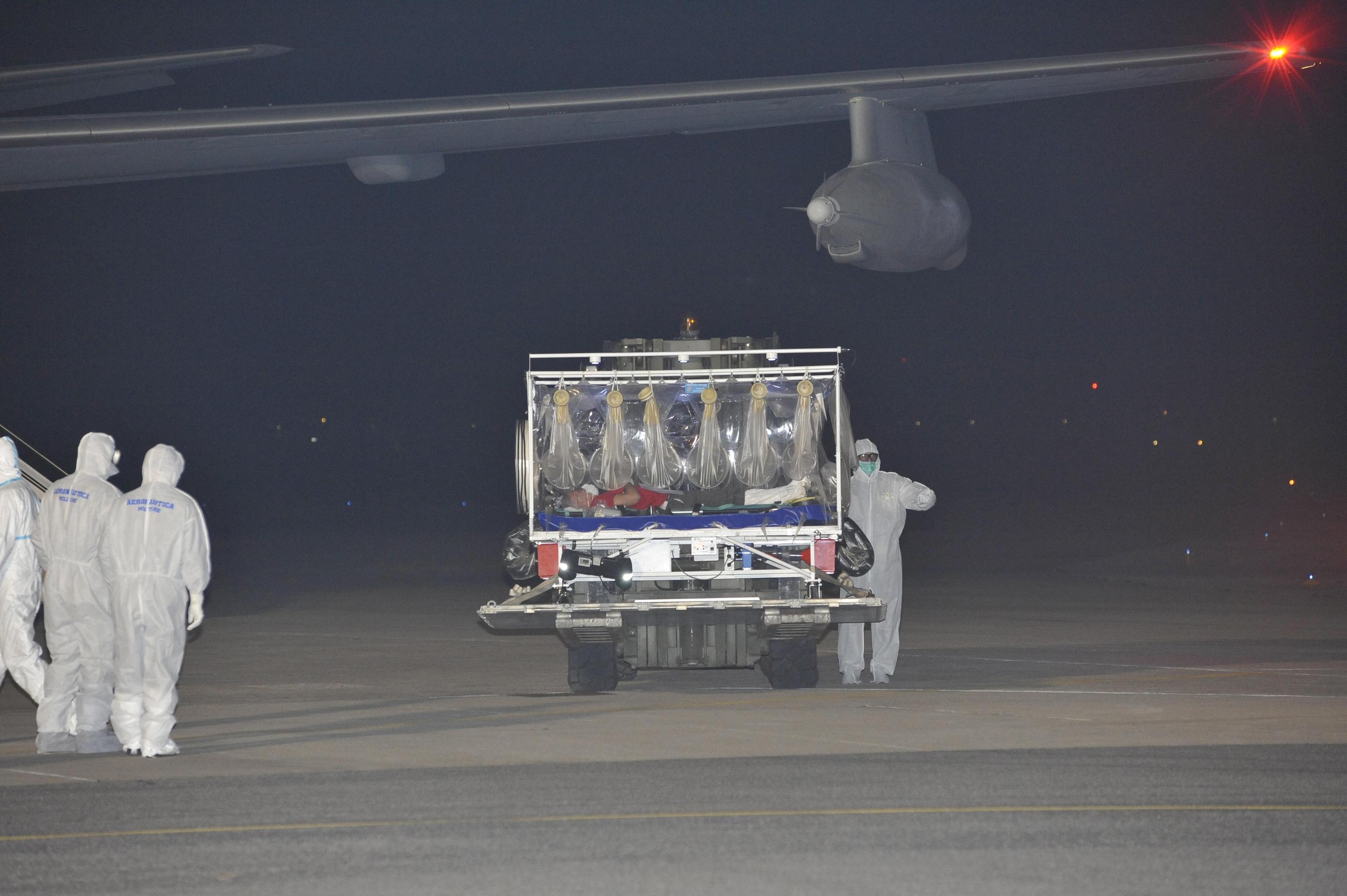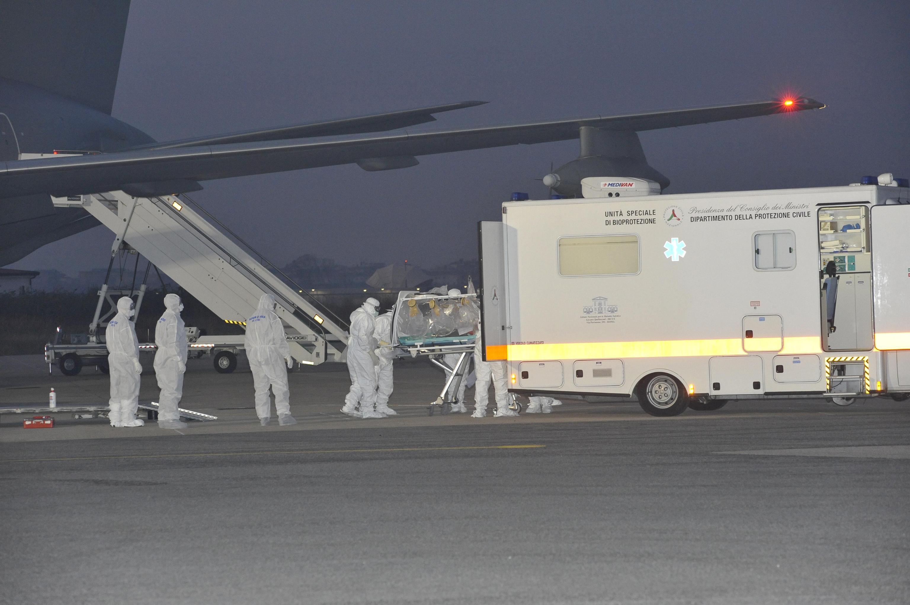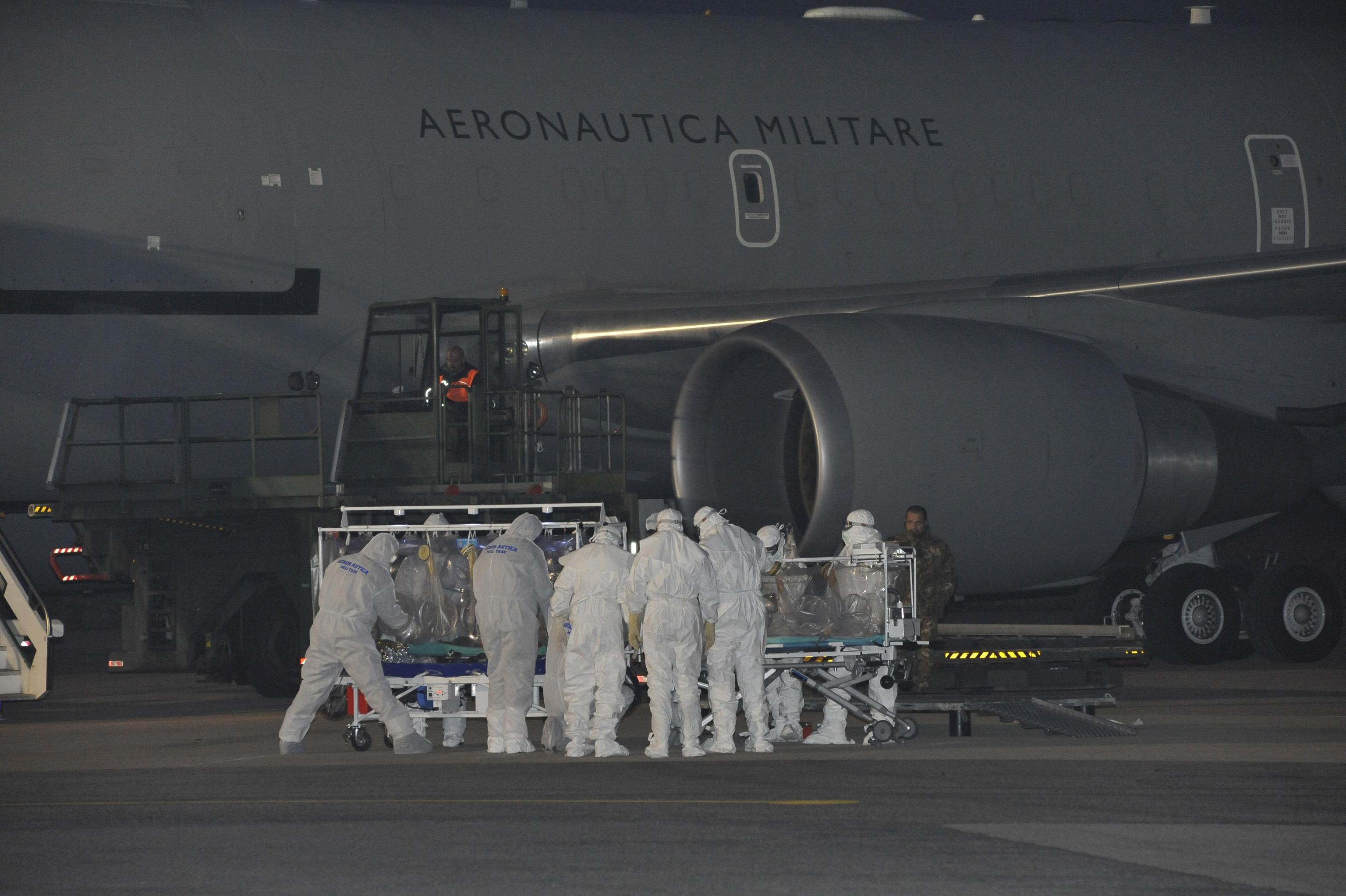 Il medico contagiato è stato prelevato in Sierra Leone, dove è atterrato e subito ripartito il Boeing KC 767 dell’Aeronautica configurato appositamente per questo tipo di trasporti sanitari di emergenza.
