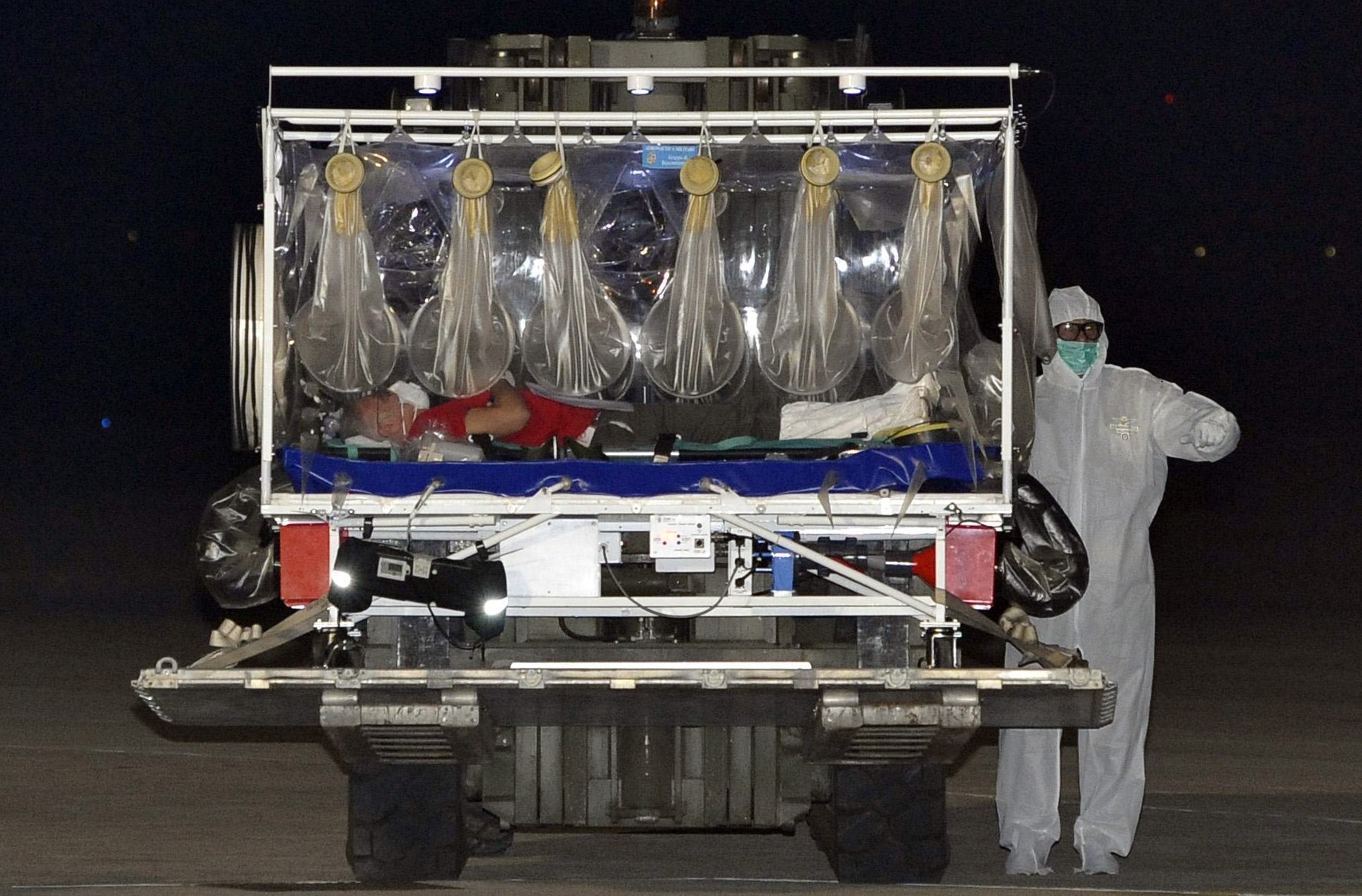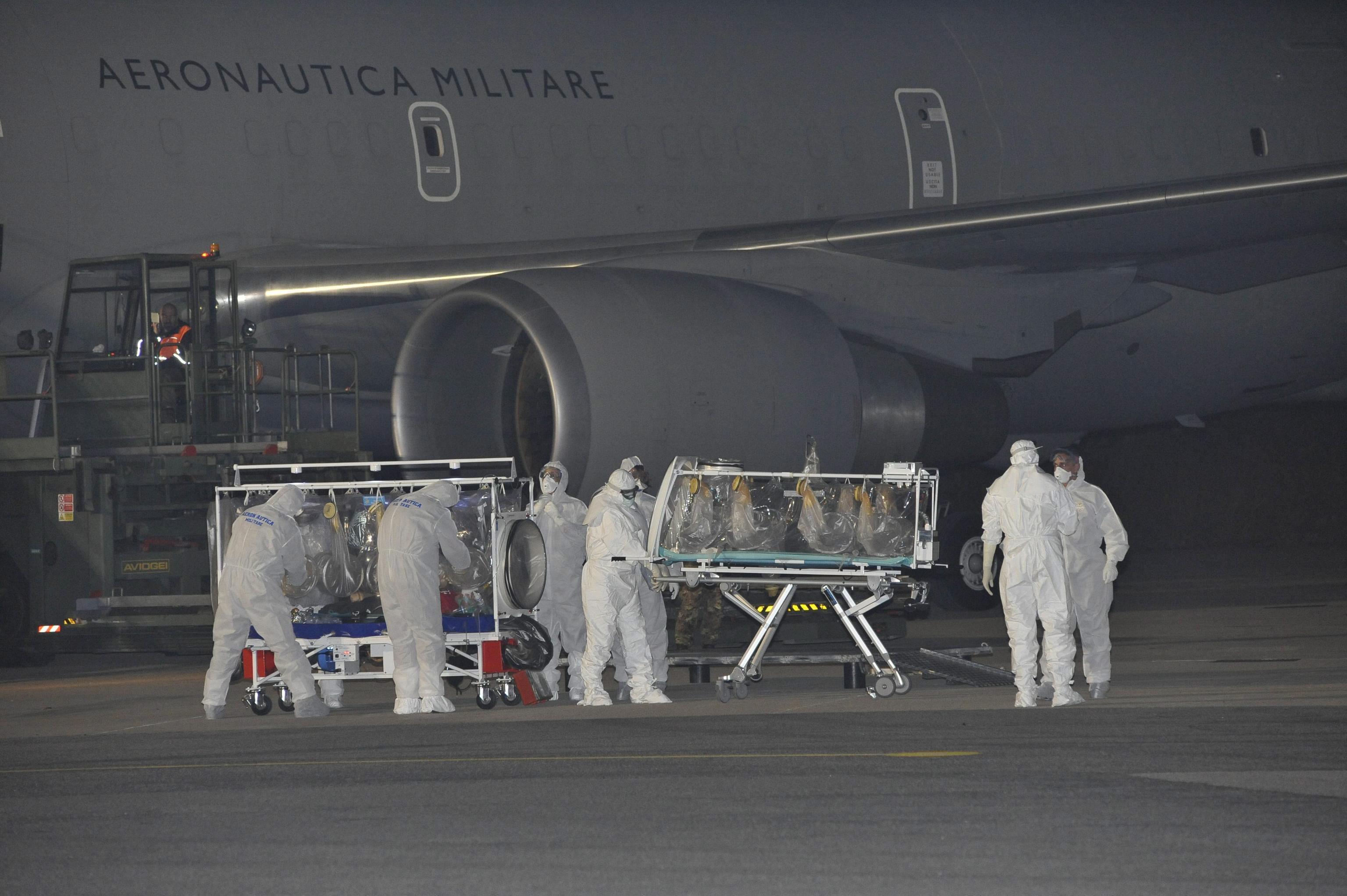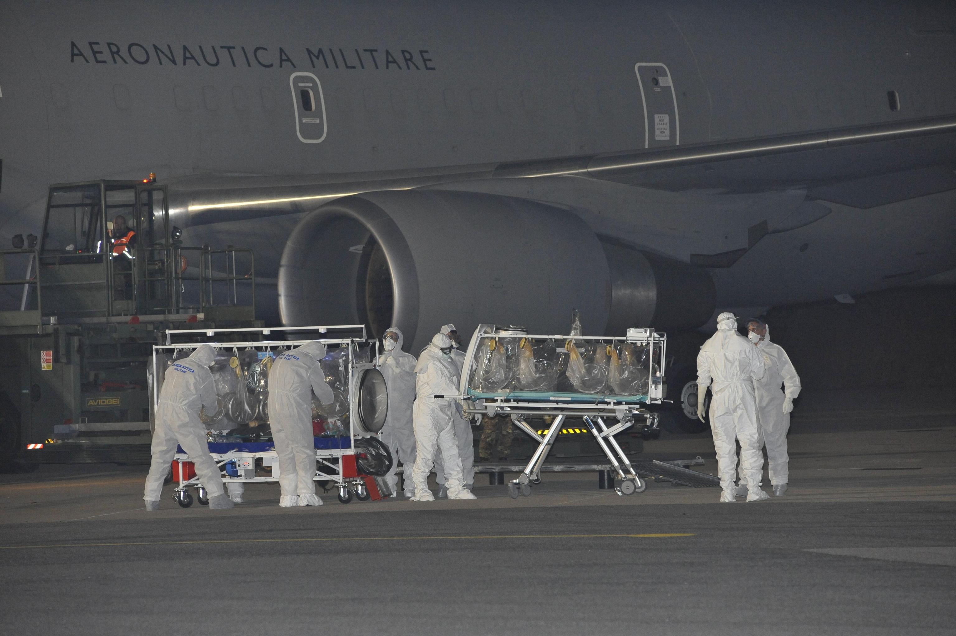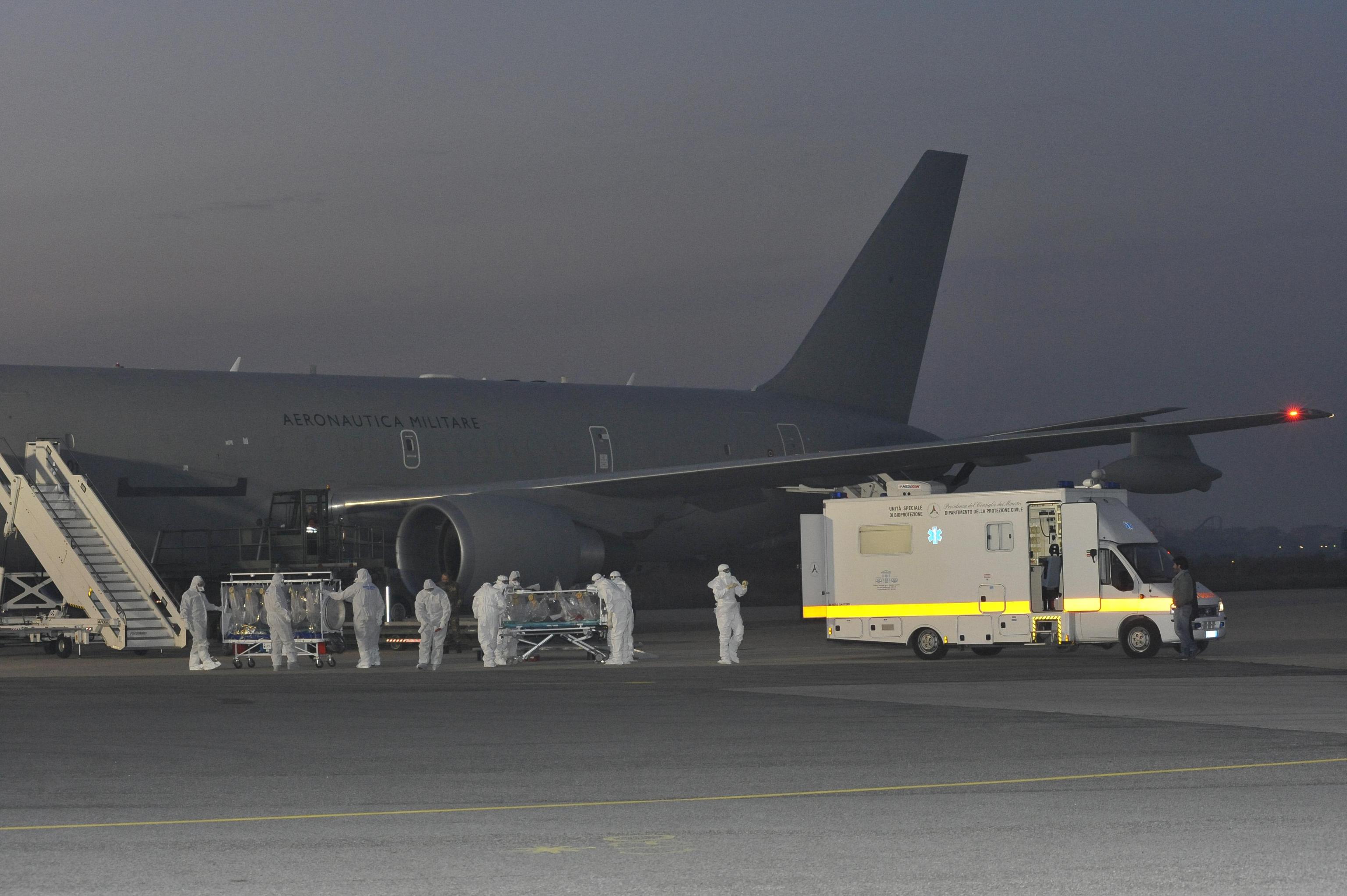 Il medico contagiato è stato prelevato in Sierra Leone, dove è atterrato e subito ripartito il Boeing KC 767 dell’Aeronautica configurato appositamente per questo tipo di trasporti sanitari di emergenza.