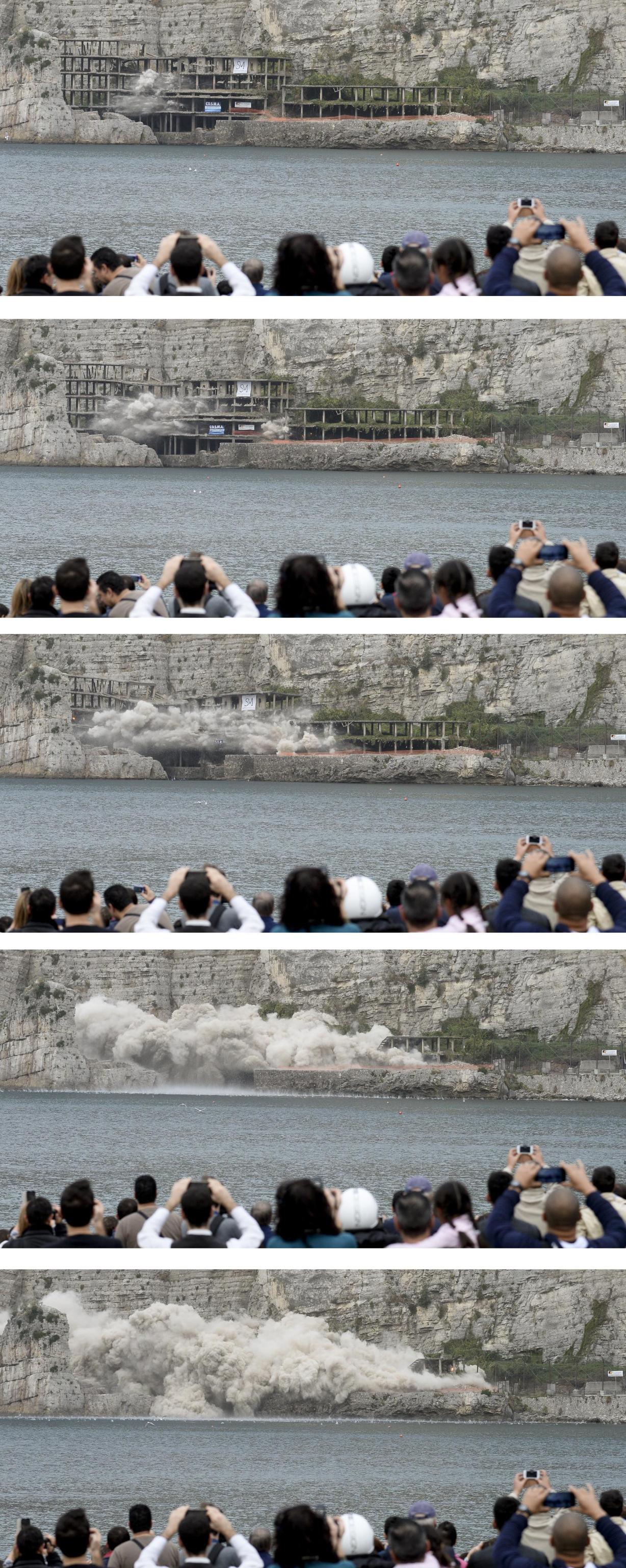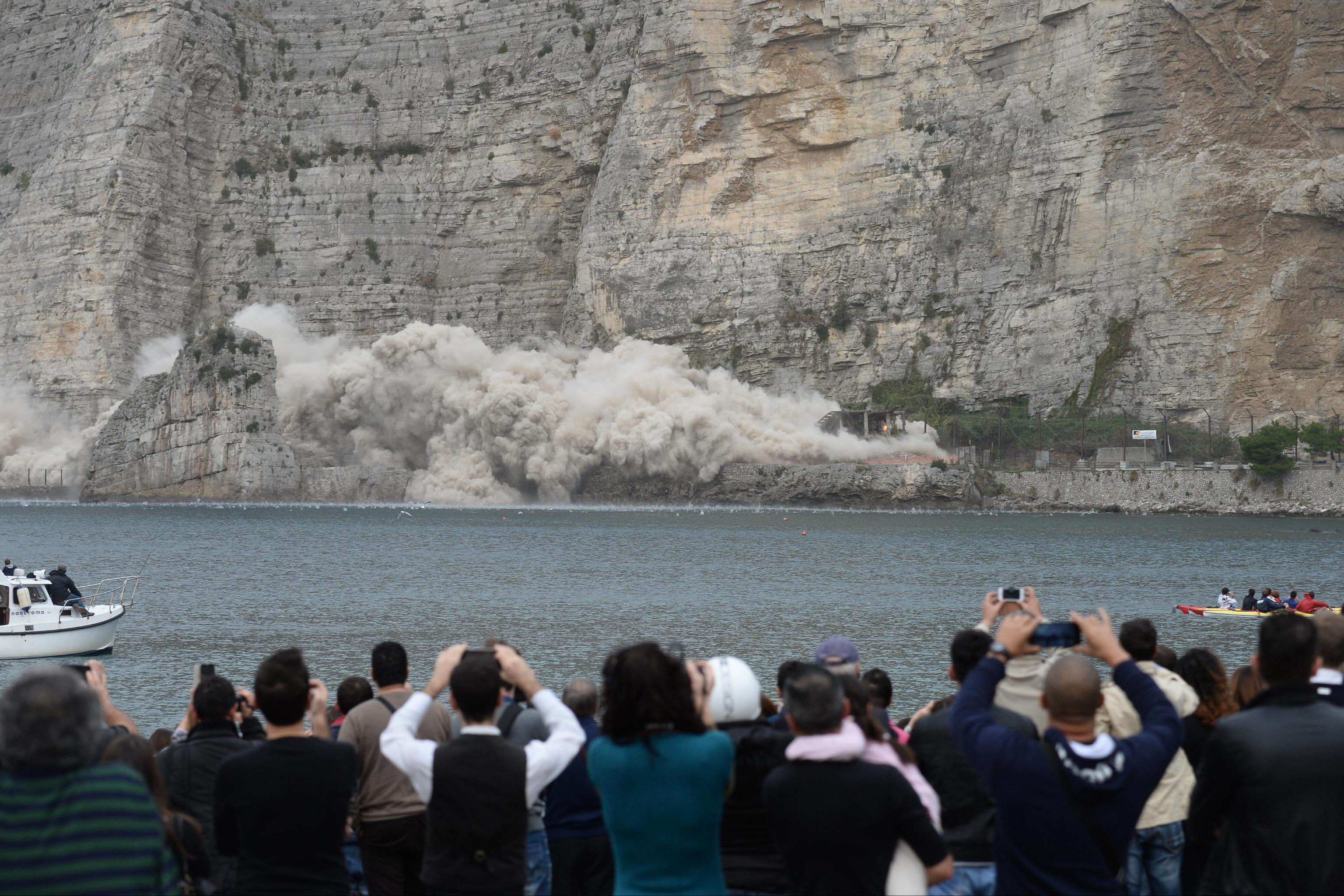 Dal mare, a bordo di una nave veloce messa a disposizione dalla Snav, la demolizione trasformata in un evento-spettacolo è stata seguita da circa 250 invitati, vip e giornalisti. Sulla spiaggia di Meta di Sorrento si sono raccolte alcune centinaia di persone. Qualcuno, approfittando della temperatura mite e dello scirocco, ha fatto anche il bagno. Sulla spiaggia anche alcune scolaresche ed una quarantina di barche che hanno seguito l’evento dal mare.