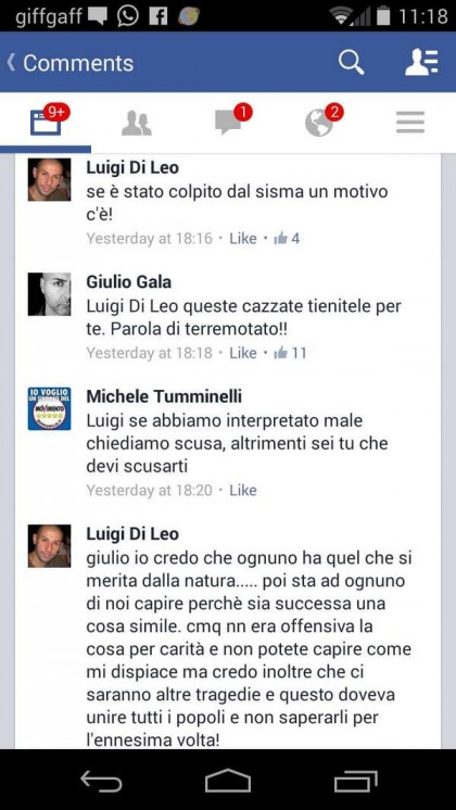 Non è tutto. Tra coloro che propongono addirittura di farsi ridare indietro i soldi, c’è anche chi azzarda l’ipotesi del terremoto come punizione: “Se è stato colpito dal sisma un motivo c’è”, ha scritto un attivista. E chi protesta e pretende delle scuse rincarando la dose: “Io credo che ognuno ha quel che si merita dalla natura”.