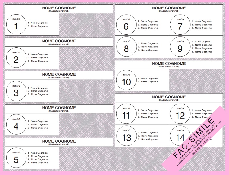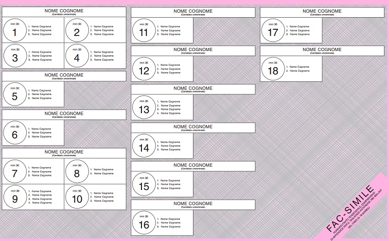 I FAC SIMILE sono di tre tipi: con 14 , con 18 o con 23 liste. Il numero delle liste dipende da regione a regione.