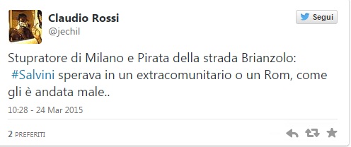 “Stupratore di Milano e pirata della strada brianzolo. Salvini sperava in un extracomunitario o in un Rom. Come gli è andata male…”.