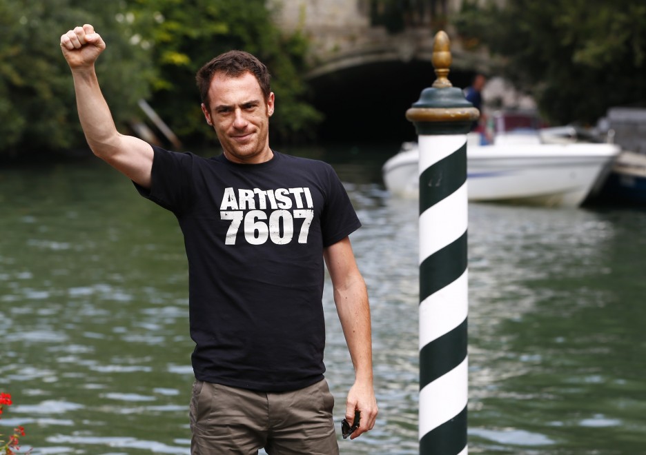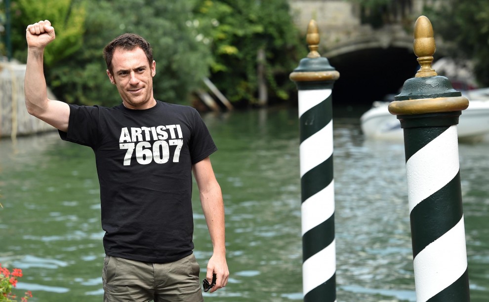 VENEZIA – Elio Germano arriva alla presentazione de “Il giovane favoloso”, pellicola diretta da Mario Martone in concorso alla 71esima edizione della Mostra del Cinema di Venezia, e saluta i fotografi con il pungo chiuso, vecchio simbolo della sinistra.