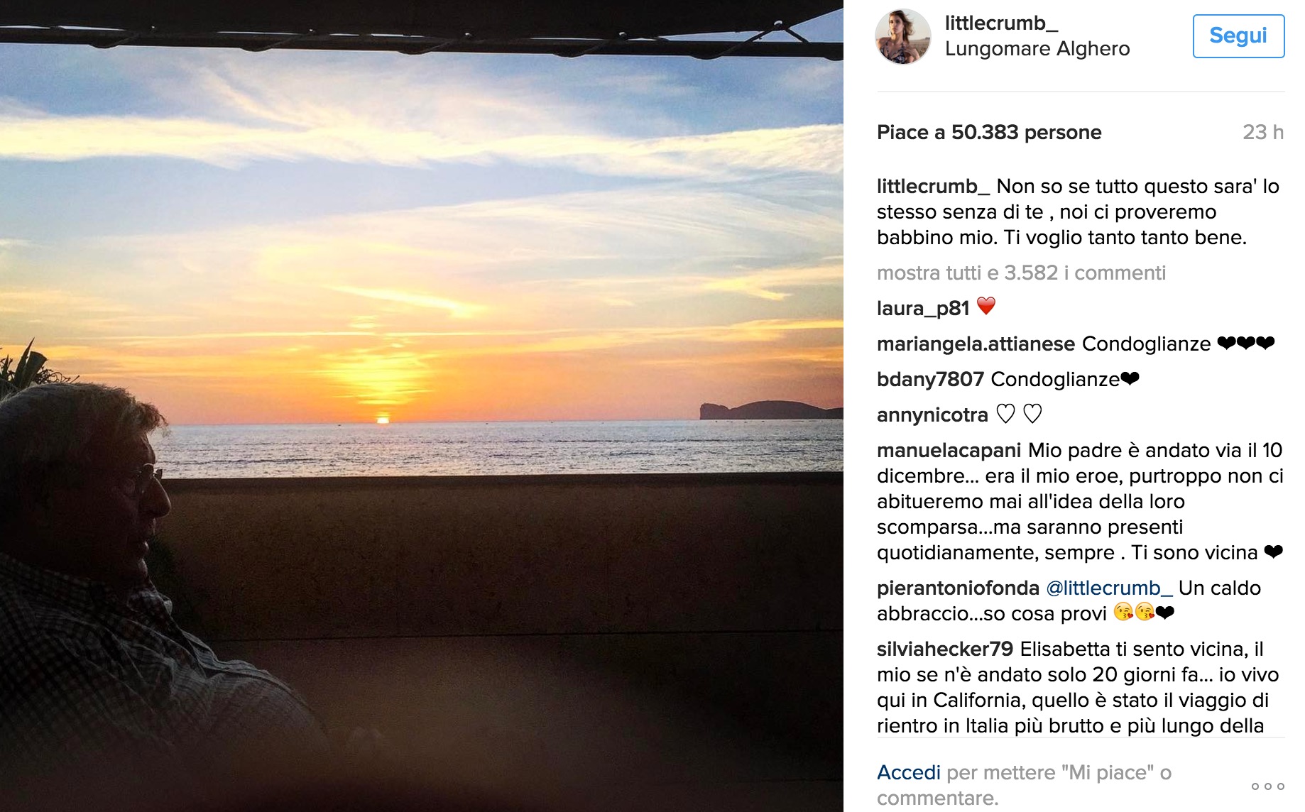 LOS ANGELES – “Non so se tutto questo sarà lo stesso senza di te. Noi ci proveremo babbino mio. Ti voglio tanto tanto bene”. Con queste parole e una foto del padre davanti al tramonto di Alghero Elisabetta Canalis ha salutato il padre, Giulio Cesare Canalis, morto improvvisamente alcuni giorni fa mentre si trovava a Los Angeles per visitare la figlia e la nipotina Skyler.
