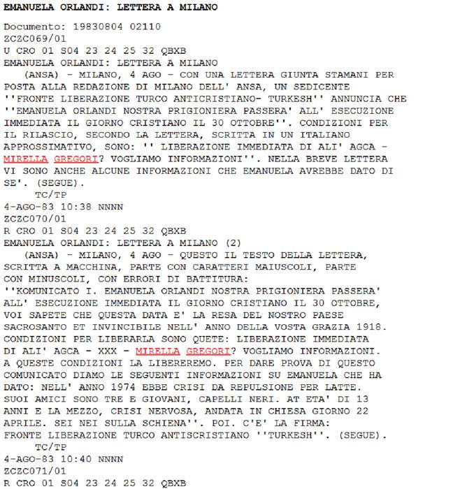 ROMA – Il 4 agosto 1983, l’Ansa trasmise la notizia ai quotidiani nazionali della lettera giunta alla redazione di Milano che mette per la prima volta in relazione le sparizioni di Emanuela Orlandi, 15 anni, e Mirella Gregori, 16. La lettera era firmata dal Fronte Liberazione Turco Anticristiano – Turkesh.