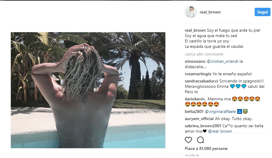 ROMA – Emma Marrone posta delle foto scattate al mare e riceve molti apprezzamenti dai suoi follower. La cantante salentina, nella foto più significativa, è in topless di spalle in piscina mentre mostra un tatuaggio sul collo, seguito da una didascalia con i versi di un brano di Rodrigo Amarante: “Soy el fuego que arde tu piel, Soy el agua que mata tu sed, El castillo la torre yo soy, La espada que guarda el caudal”.