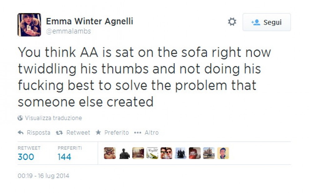 La Winter ha scritto, dopo i tanti insulti ricevuti: “Ma credete che AA (Andrea Agnelli) se ne stia qui sul divano a girarsi i pollici invece di fare il suo fottuto meglio per risolvere un problema che qualcun altro ha creato?“. Il riferimento è ovviamente a Conte.