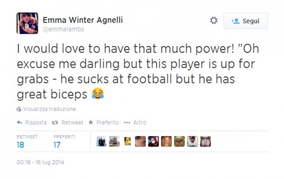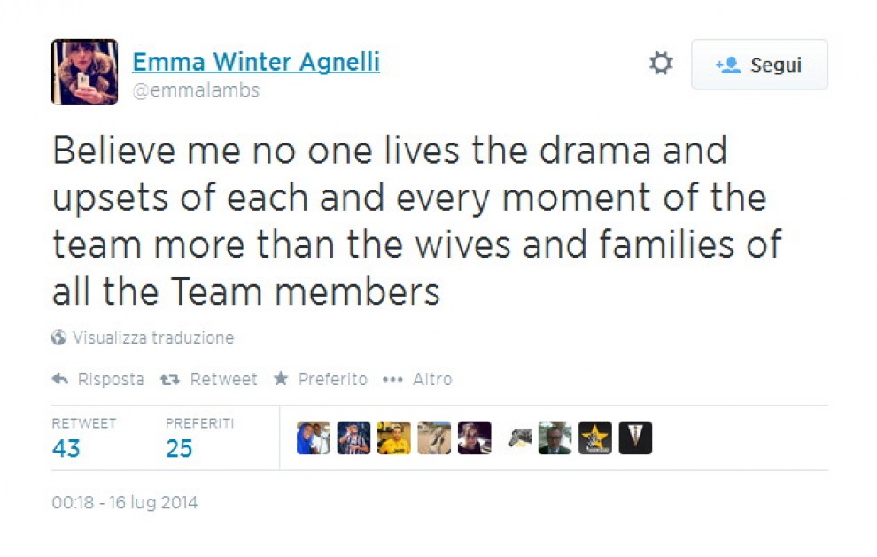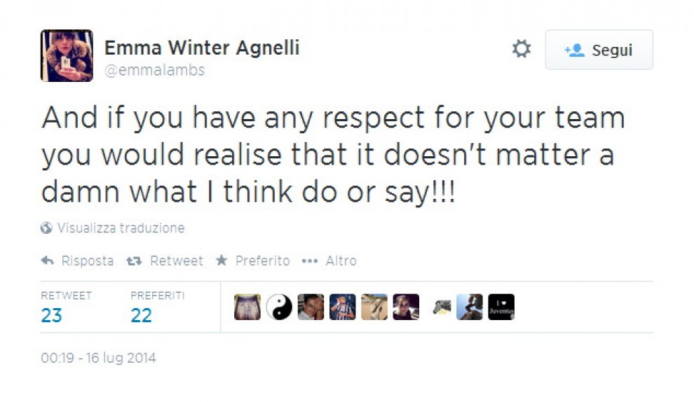 TORINO – Emma Winter difende su Twitter l’operato del marito Andrea Agnelli, dopo l’addio di Antonio Conte dalla panchina della squadra bianconera rimpiazzato da Massimiliano Allegri contro il volere di larga parte del tifo.