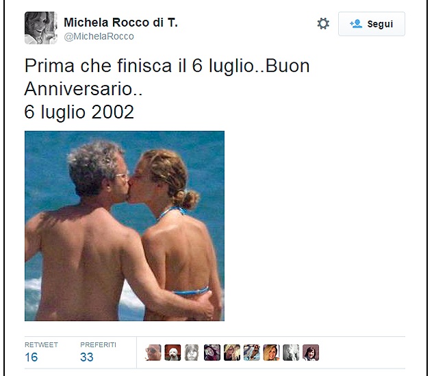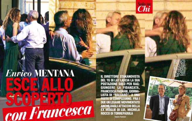 ROMA – Enrico Mentana e Francesca Fagnani escono allo scoperto. I due sono infatti stati paparazzati dal settimanale Chi a Roma mentre si lasciano andare in baci e abbracci in strada. Mentre l’ex moglie del direttore del TgLa7, Michela Rocco di Torrepadula, non sembra aver ancora mollato la presa: lo scorso 6 luglio ha postato su Twitter una foto nostalgica celebrando il loro anniversario di matrimonio.