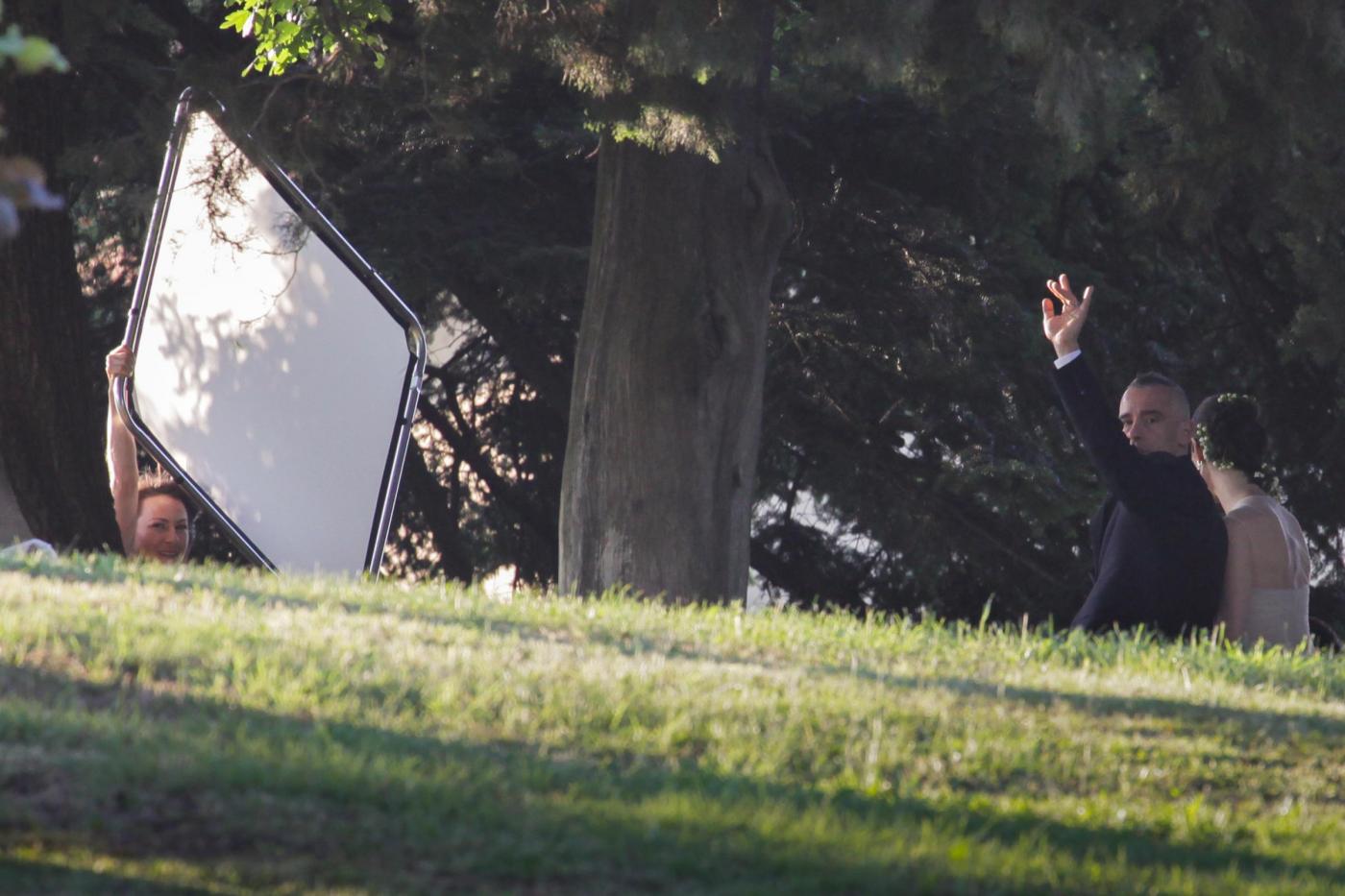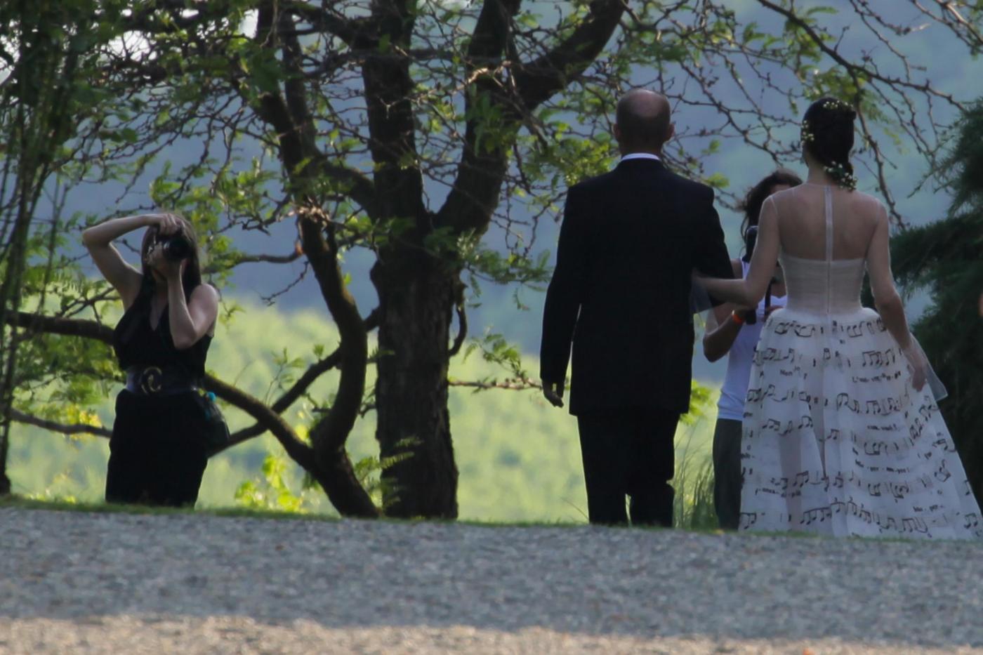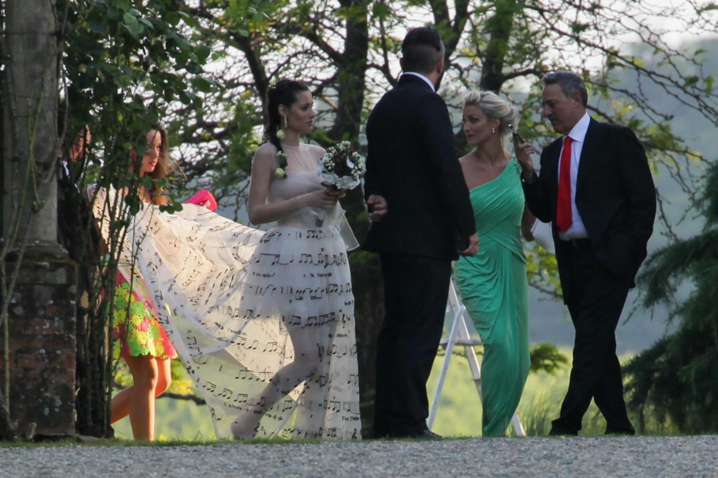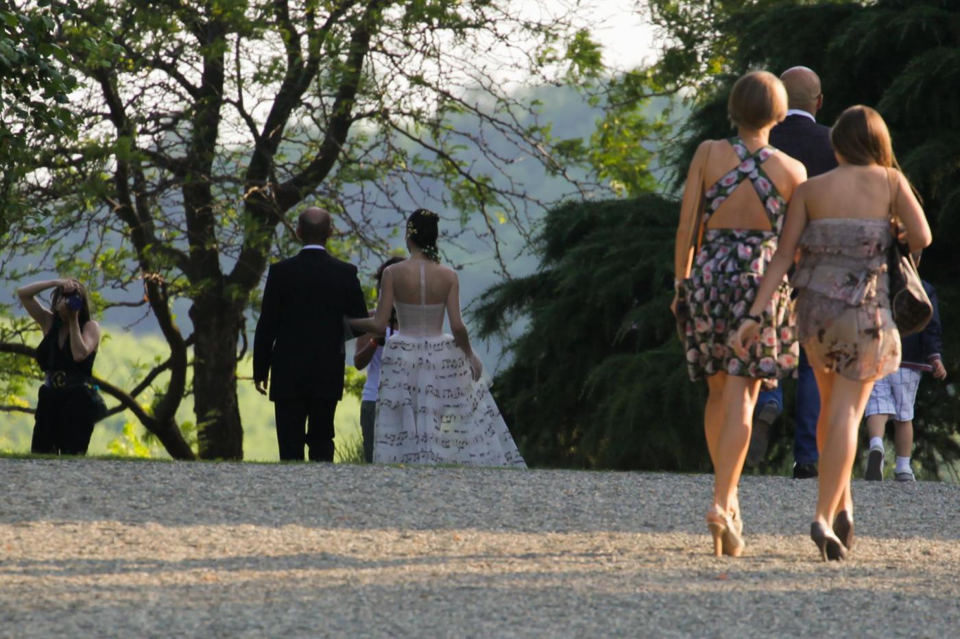 Gli abiti per questa festa di nozze qualche settimana dopo la cerimonia di nozze che si è tenuta a Milano con la presenza solo di due testimoni, sono firmati da Valentino. La sposa indossa un vestito decorato con motivi ispirati agli spartiti musicali.