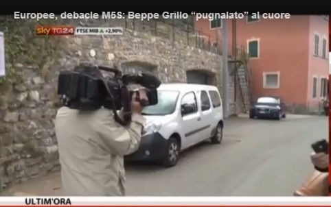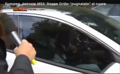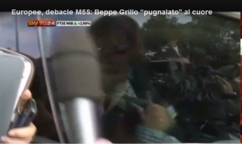 SANT’ILARIO (GENOVA), 26 MAG – Dopo la notte passata a seguire i risultati (per lui deludenti) delle elezioni Europee 2014, il leader del Movimento 5 Stelle Beppe Grillo ha lasciato poco prima delle 9 la sua villa di Sant’Ilario. Grillo, a bordo di una Kia bianca guidata da un’autista, non ha parlato con i giornalisti, ma ha sorriso ed ha mimato il gesto una pugnalata al cuore.