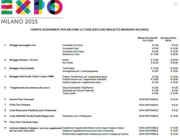 Per evitare le ore ed ore di fila garantita ai visitatori in arrivo da tutto il mondo, numerosissimi soprattutto in questi ultimi giorni di Expo (che si chiuderà il 31 ottobre) non ci sono permessi che tengano. Così la fantasia si scatena, tanto che sulla pagina Facebook dell’Expo alla voce “discussioni sul tema” era comparso un vero e proprio tariffario dell’assurdo, con prezzi per noleggiare stampelle, bambolotti, bambini veri e propri, anziani e persino una falsa carta d’identità del fratello di Giuseppe Sala, commissario unico di Expo.