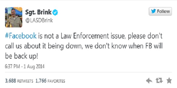 LOS ANGELES – Quando Facebook non funziona, ormai si consumano scene di panico. E’ l’effetto della dipendenza digitale di milioni di persone. Ma addirittura chiamare la polizia…un agente americano, Burton Brink, è finito nei guai per aver twittato questo messaggio: