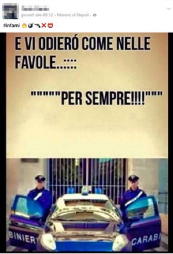 Il refrain prevede i soliti post di odio verso le forze dell’ordine: «Tr…e polizia, stessa porcheria». Oppure: «Finché vivrò contro di te starò» corollario di un muro con la scritta Acab (acronimo inglese di «tutti i poliziotti sono bastardi»). Ma ci sono anche commenti malinconici, quelli riservati ai padri o ai fratelli in cella. Scrive la figlia di un detenuto: «Vita mia, oggi è il tuo onomastico e con questo sono cinque che non festeggiamo insieme…Auguri di una presta libertà ». Un ragazzo posta: «Tra poche ore il leone uscirà dalla sua gabbia» e pubblica la foto del padre nell’atto di lanciargli un bacio.